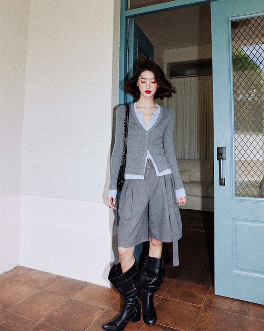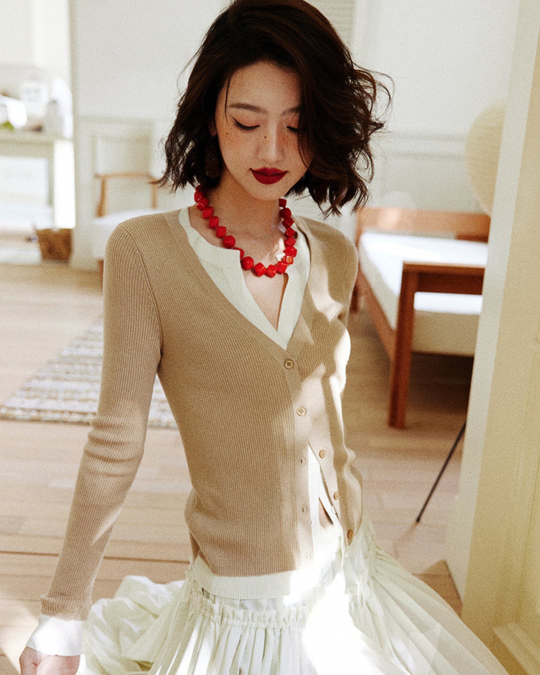 コントラストの効いたバイカラーデザインが印象的なVネックカーディガン。軽やかなウール混素材で、秋の羽織りやレイヤードスタイルにぴったり。コンパクトなシルエットで女性らしいラインを演出します。