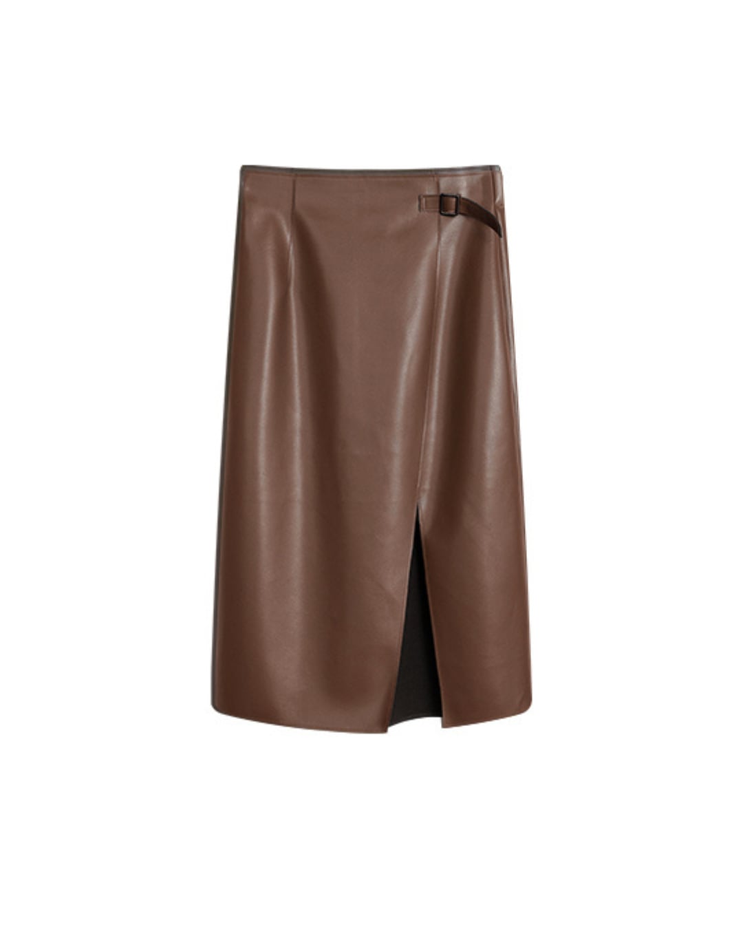 上品な光沢感が魅力のフェイクレザースカート。ウエスト部分のサイドバックルがアクセントになり、タイトなシルエットとフロントスリットが女性らしさを引き立てます。ハイウエストデザインで脚長効果も◎。秋冬のキレイめコーデにぴったりな1枚です。