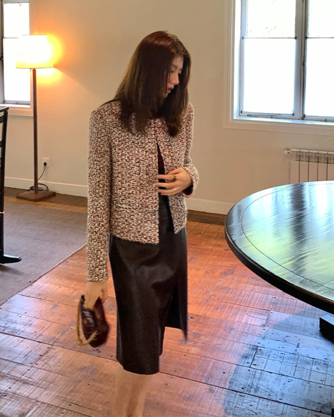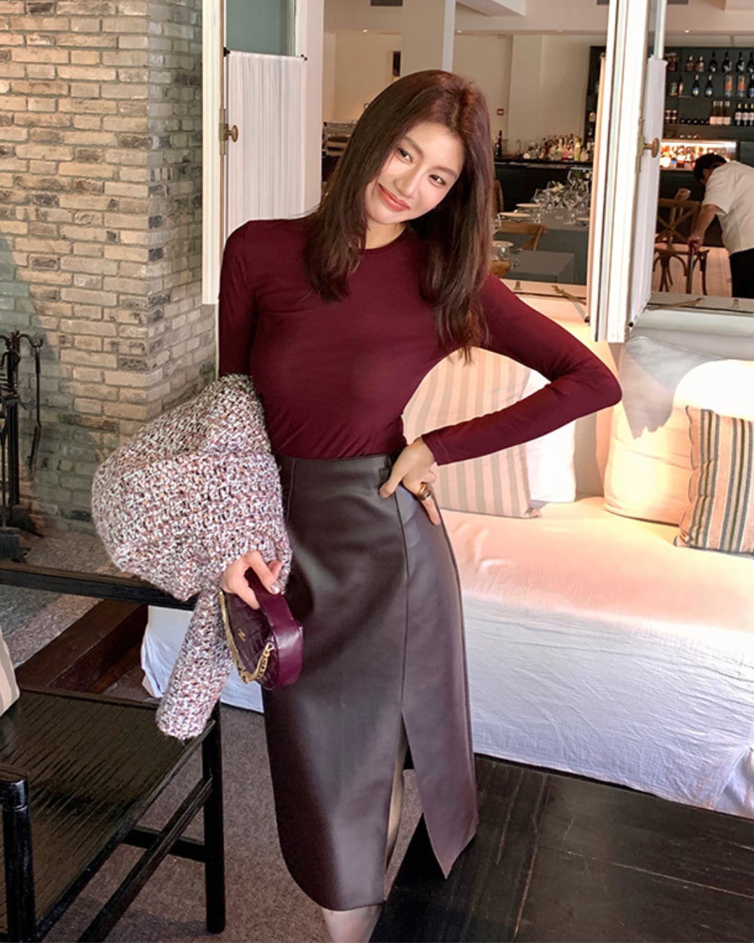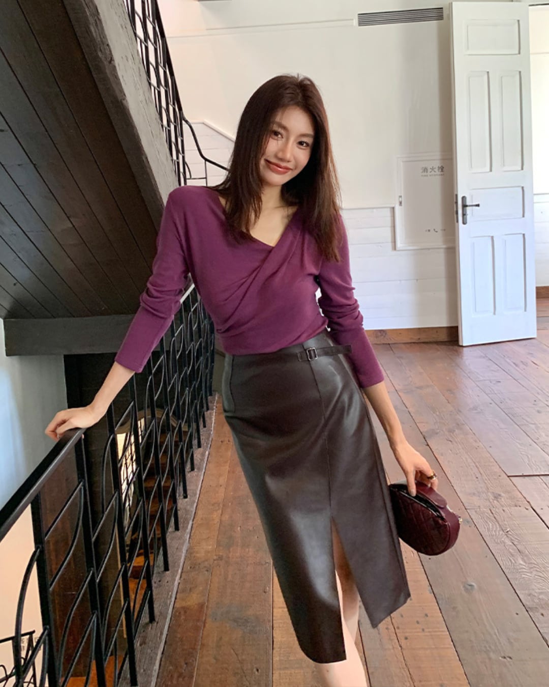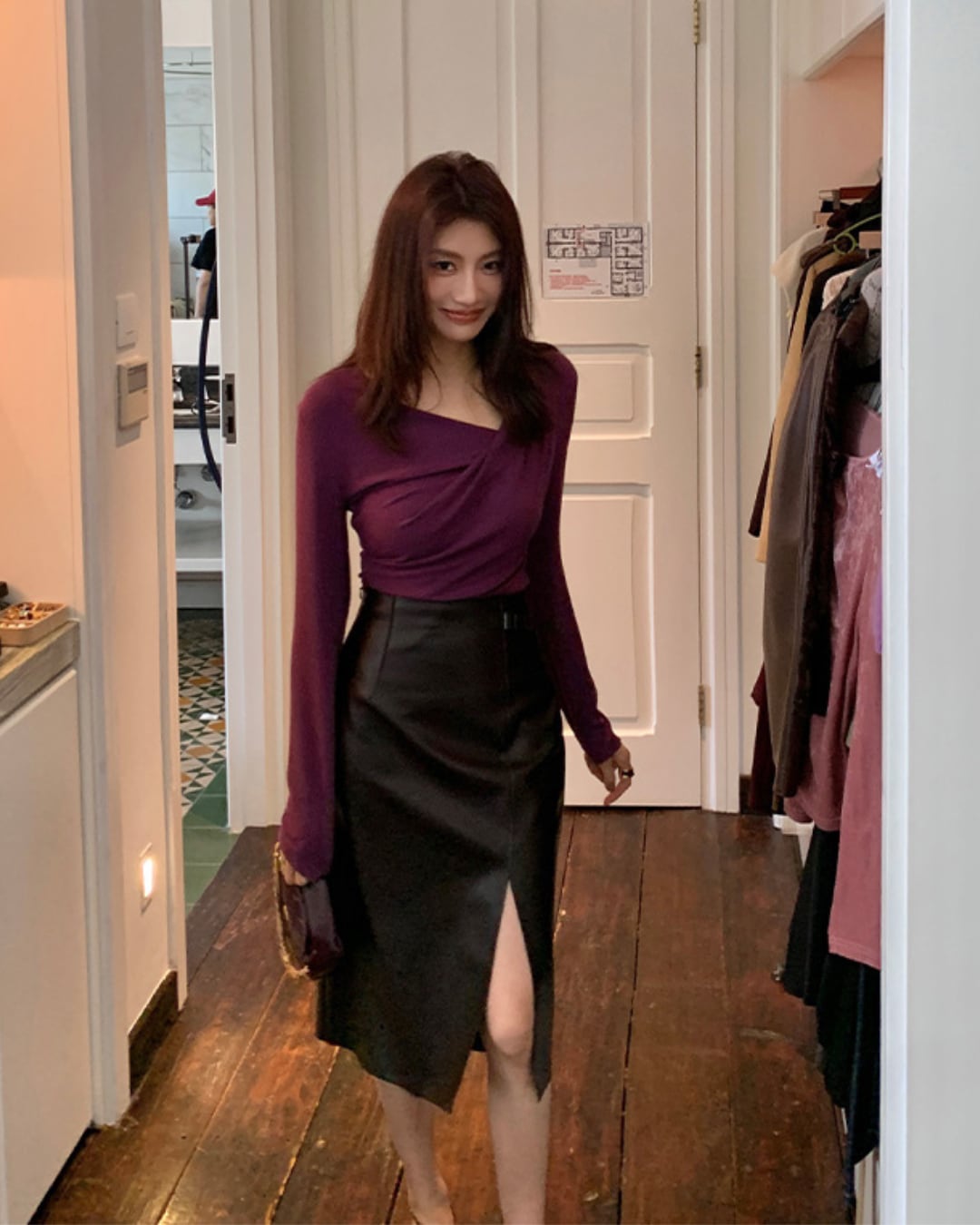 #フェイクレザー #スリットスカート #ハイウエスト #秋冬コーデ #大人カジュアル #バックルデザイン