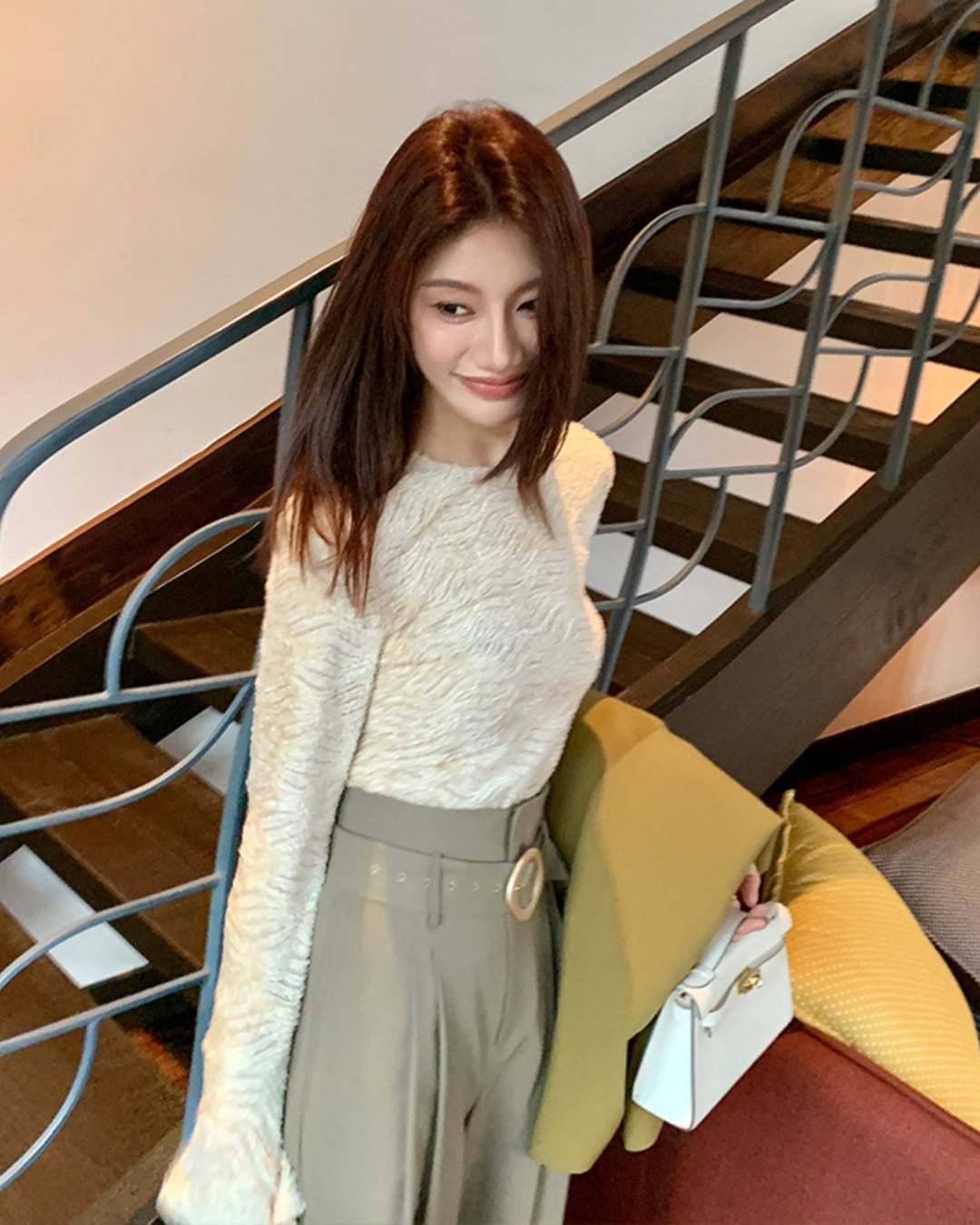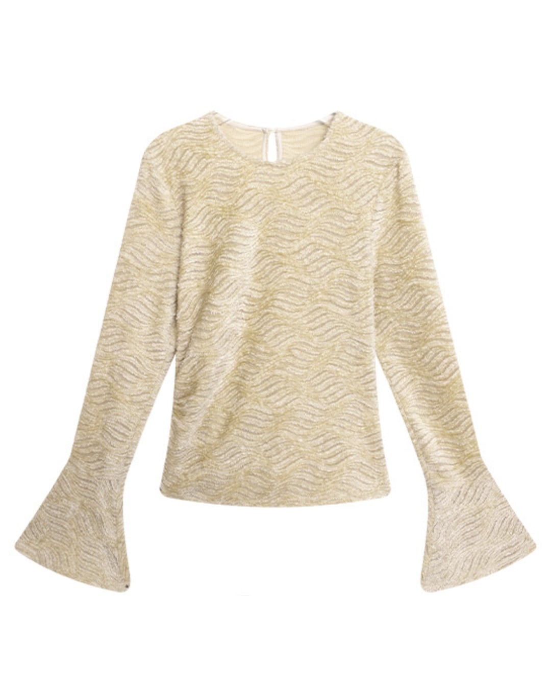光沢感のあるジャカード生地を使用したトップス。立体感のある織柄が高級感を演出し、袖口のフレアデザインが華やかさをプラス。上品なアイボリーカラーで、ボトムス次第でフォーマルにもカジュアルにも合わせやすい万能アイテムです。