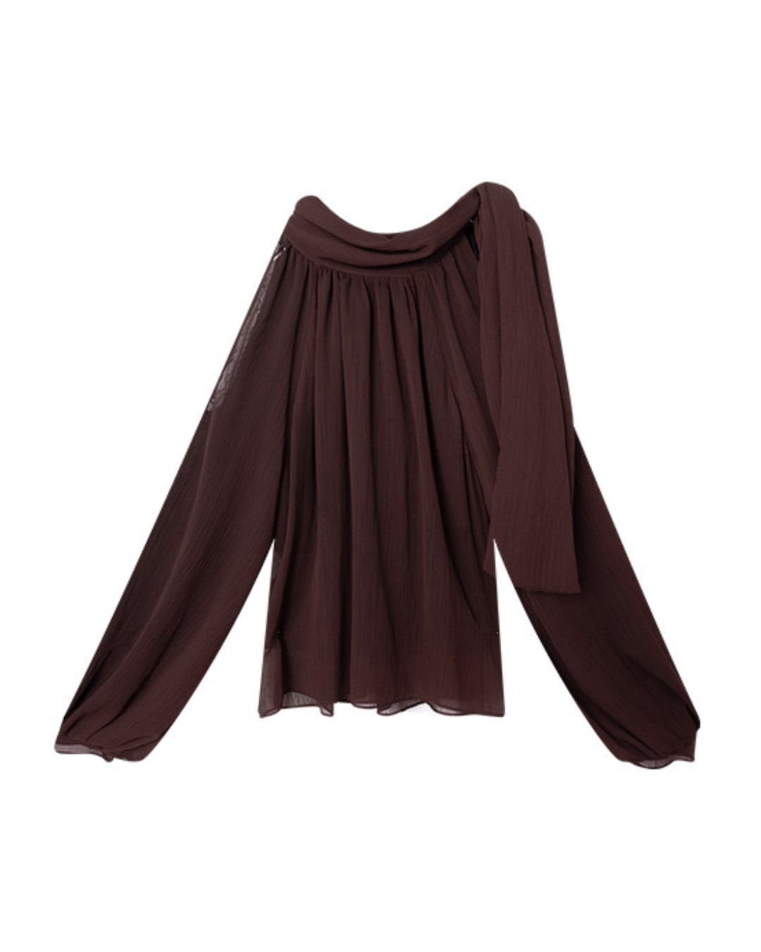 軽やかなシフォン素材で仕立てたリボンタイ付きブラウス。肩から流れるようなボリュームスリーブが華やかで、首元のリボンが女性らしさを引き立てます。柔らかなミルキーベージュと落ち着いたパープルの2色展開で、オンオフ問わず着回し可能なアイテムです。