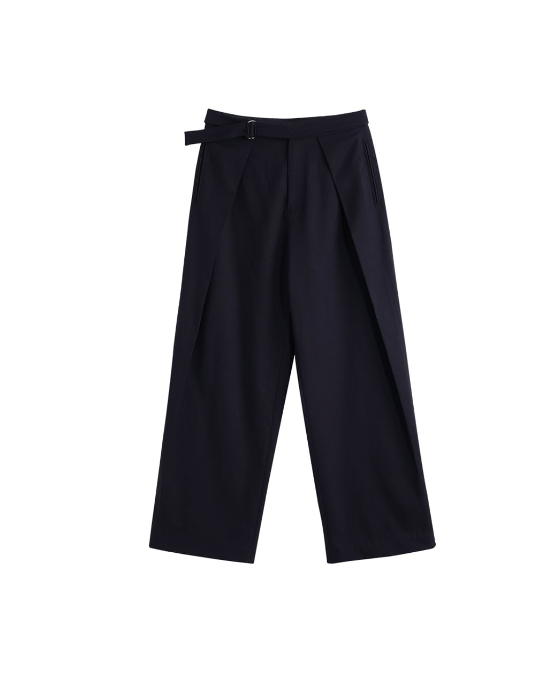 洗練されたシルエットが魅力のドレープパンツ。クロスウエストのデザインと程よいワイド感が、大人の抜け感を演出してくれます。落ち着いたブラックカラーで、カジュアルからモードまで幅広いコーディネートに対応。