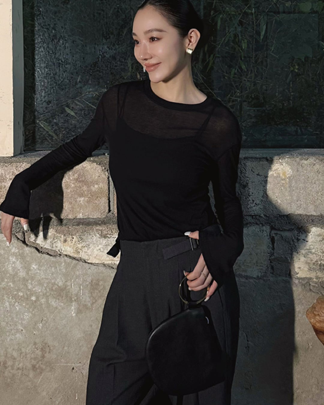 シアー感のあるトップスとタンクトップのレイヤードセット。透けすぎない上品な透け感としなやかなフィット感が大人の魅力を引き立てます。秋のレイヤードスタイルにぴったりの一着です。
