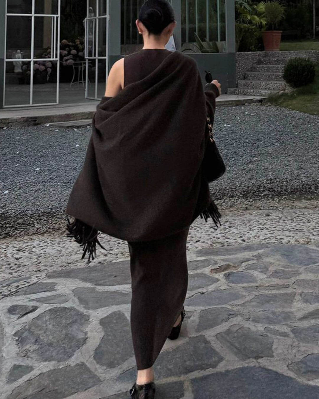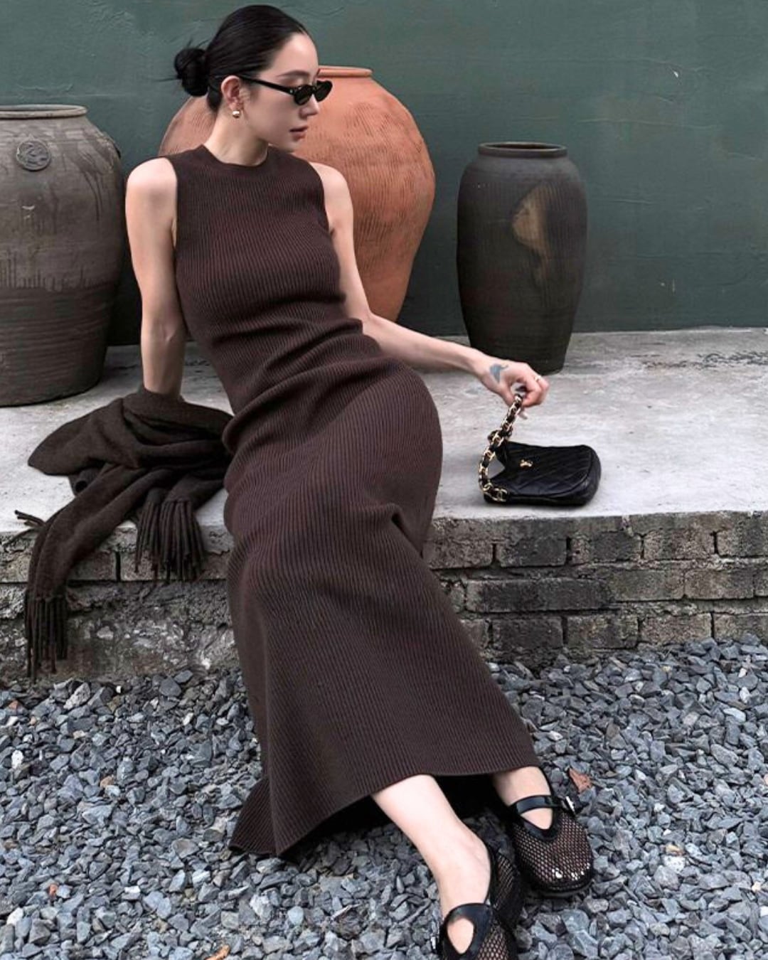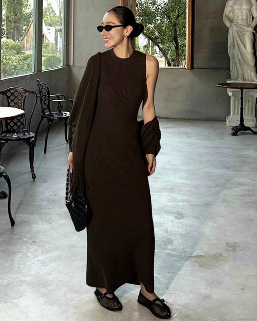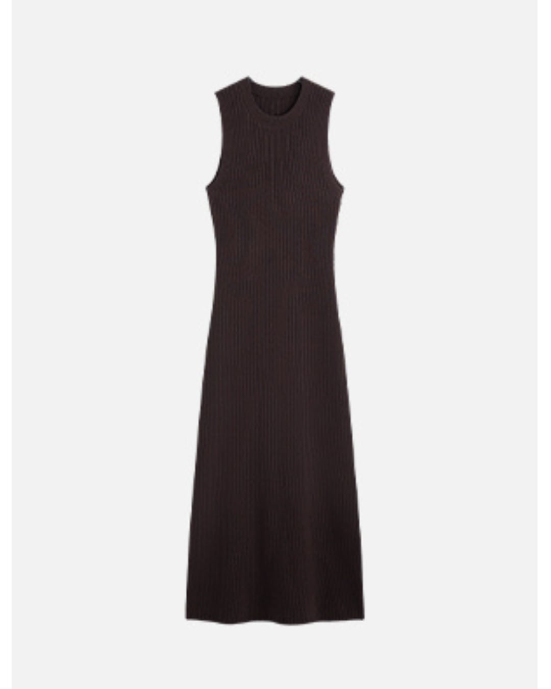 すっきりとしたIラインが美しい、ノースリーブのニットワンピース。柔らかく体に沿うフィット感と、クラシカルなカラートーンが魅力。羽織りやアクセサリーとの相性も抜群で、秋冬の主役アイテムとして活躍します。