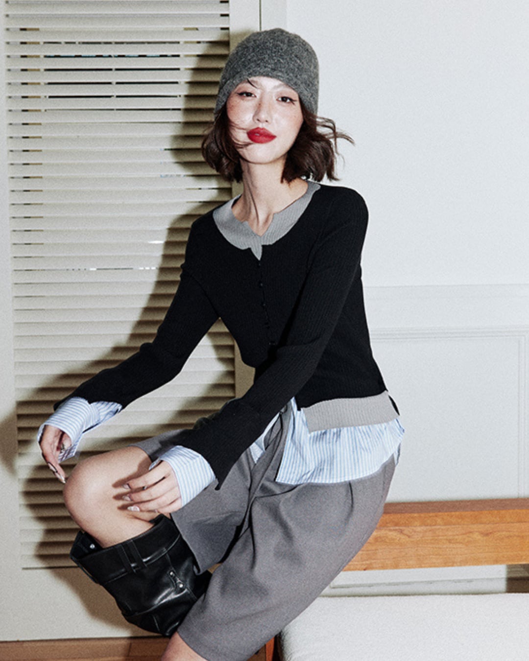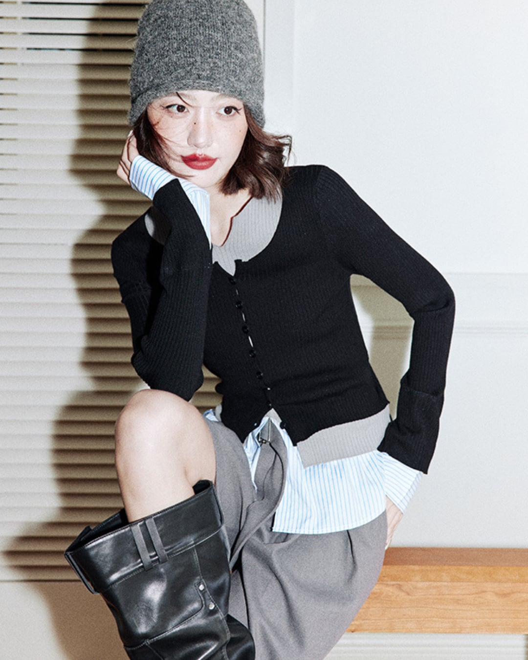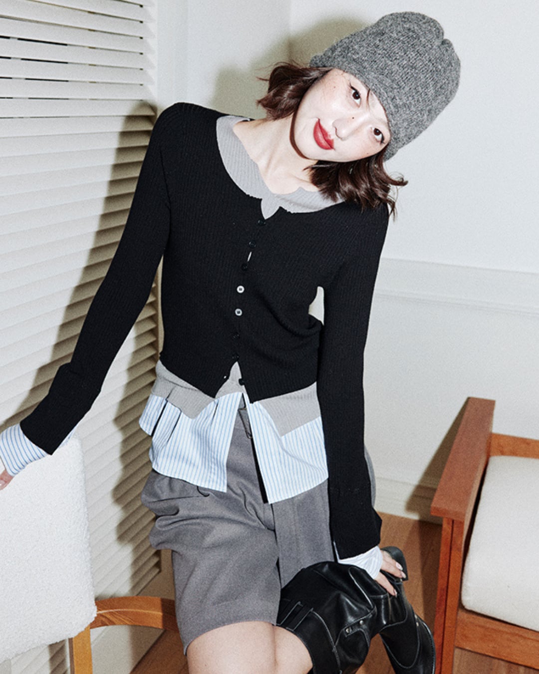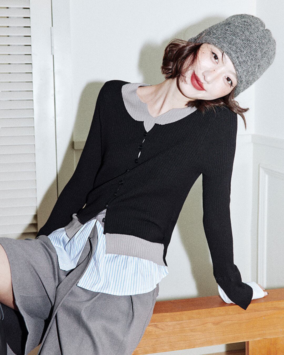 シャツを重ね着したようなレイヤードデザインのカーディガン。襟元と袖口のストライプがアクセントになり、1枚でコーデが完成する主役トップスです。柔らかなリブニット素材で着心地も抜群◎