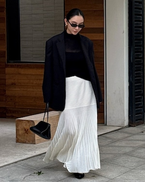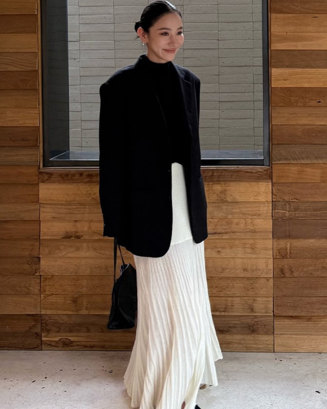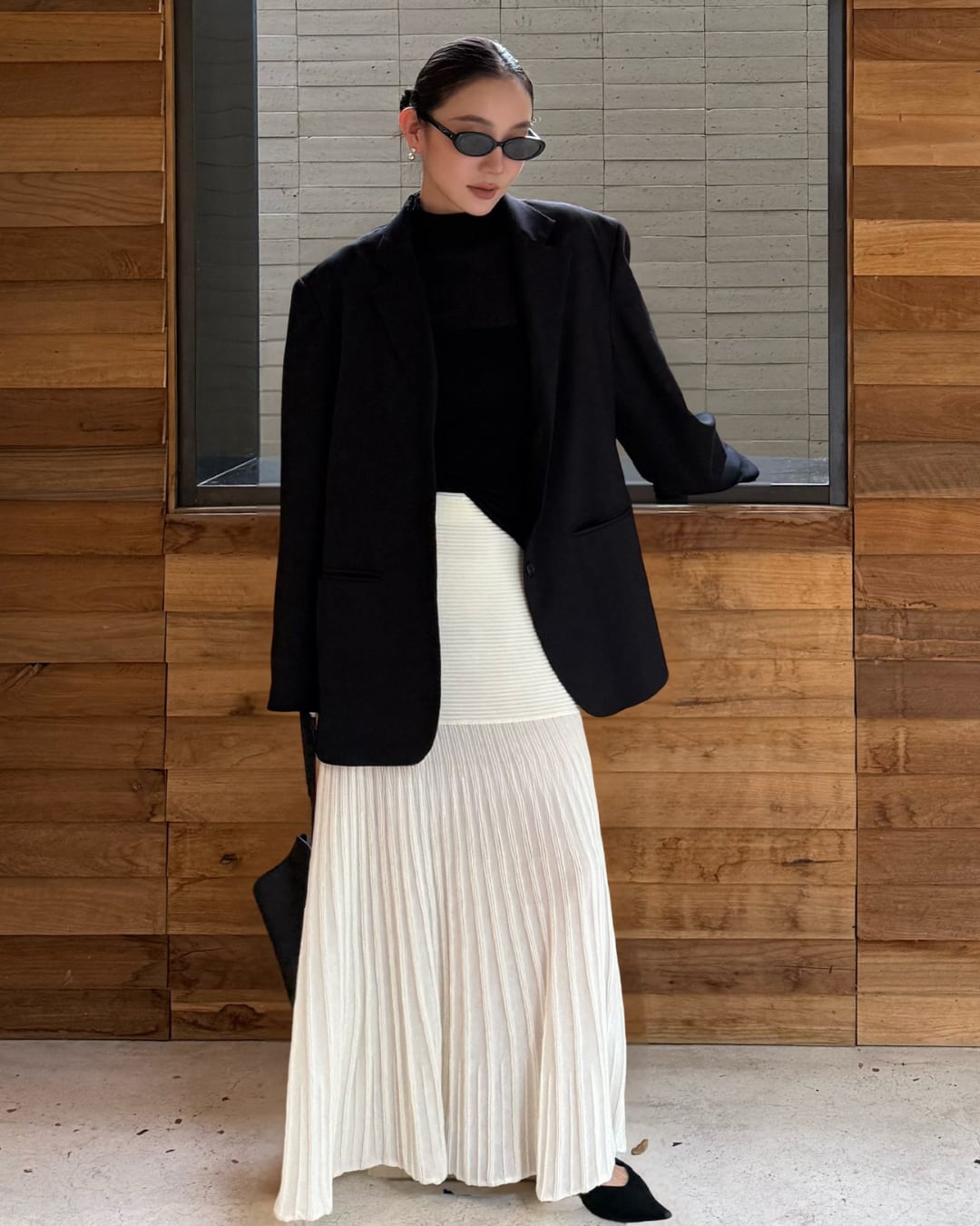 #プリーツスカート #ホワイトコーデ #ニットスカート #フェミニン #揺れ感スカート #ロング丈スカート