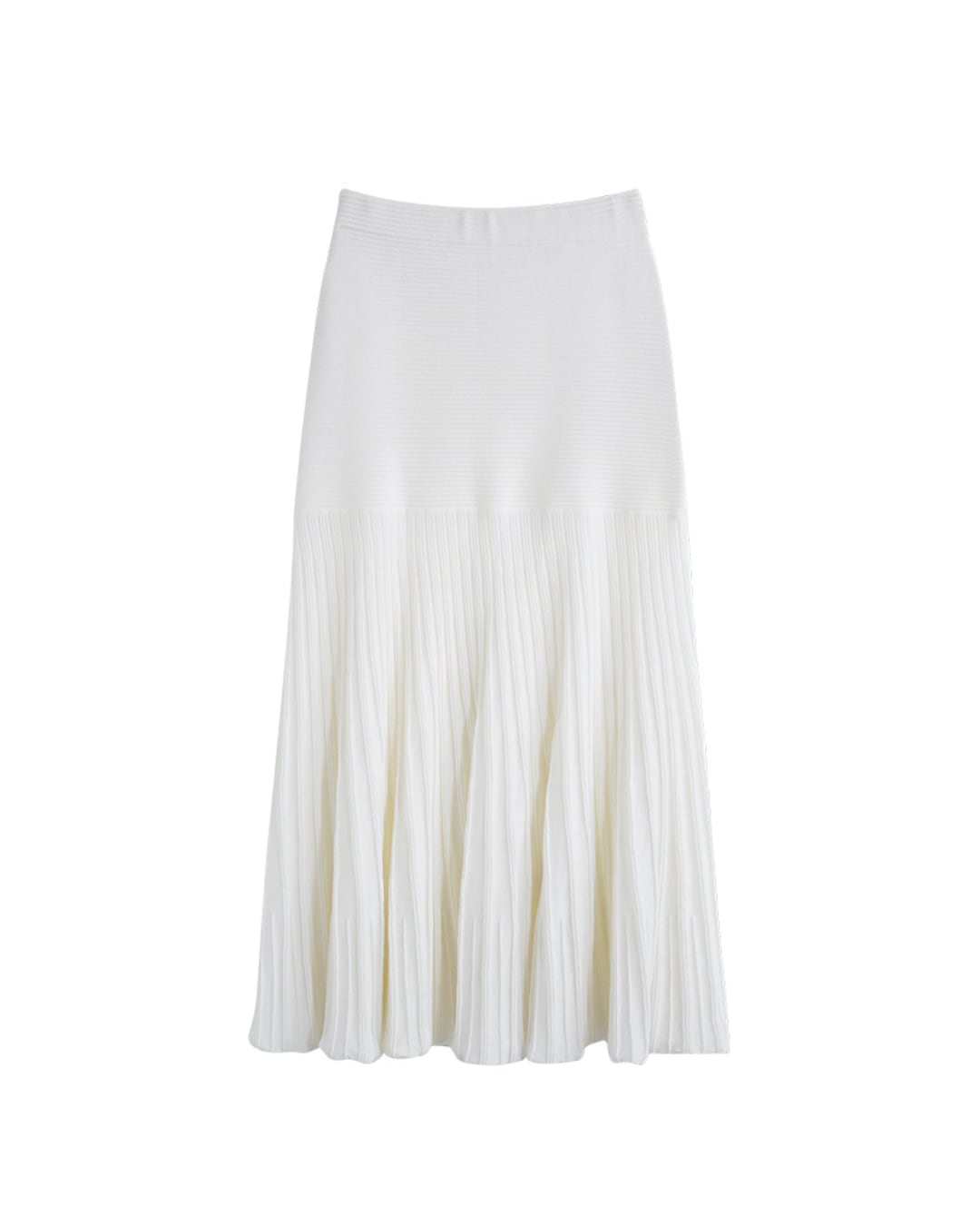 柔らかく繊細なプリーツが揺れる上品なロング丈ニットスカート。ウエストから裾にかけて広がる美しいシルエットが女性らしさを引き立てます。ホワイトトーンの軽やかな素材感で、ニットながらも重たく見えず、きれいめにもカジュアルにも着回しやすい一枚です。