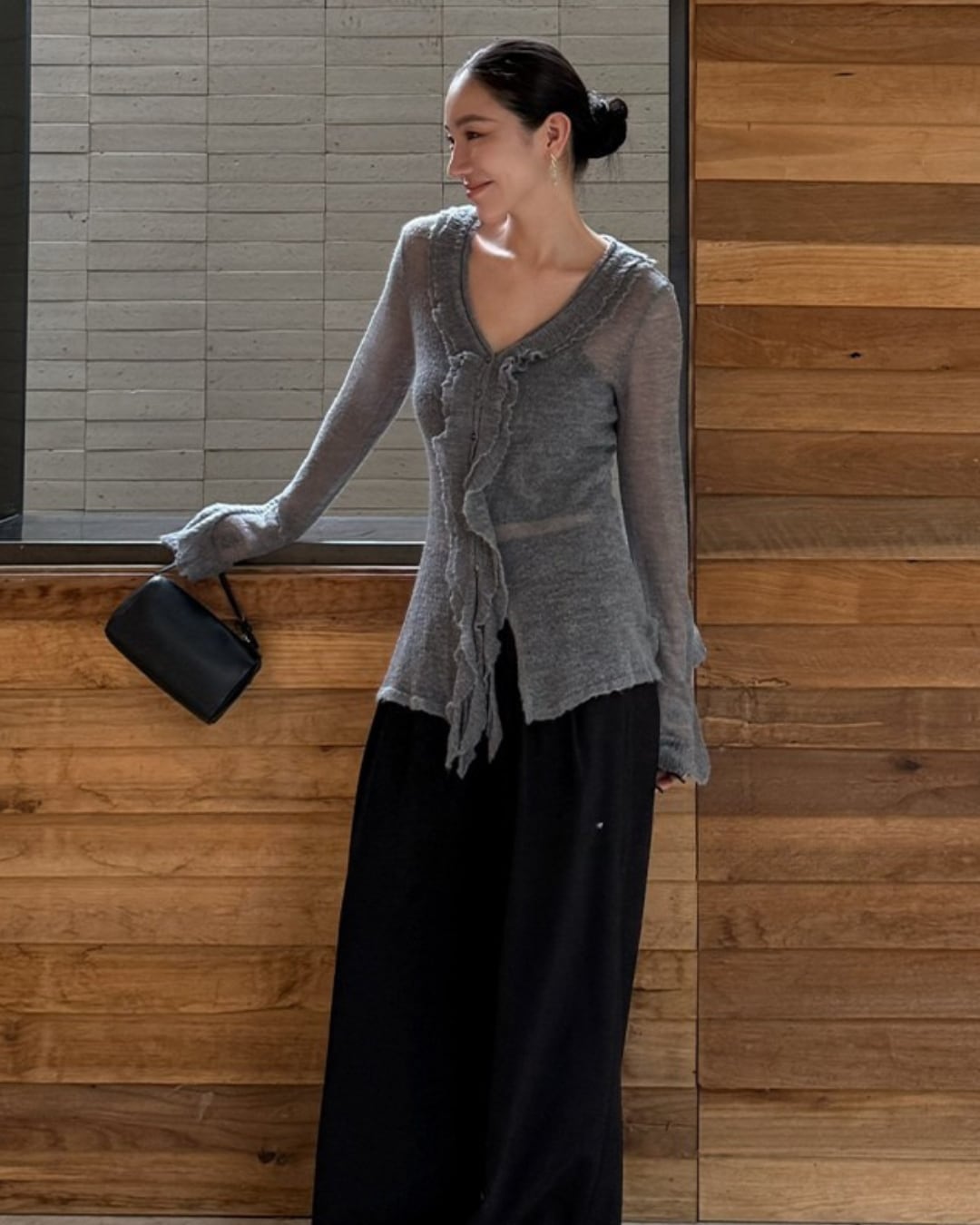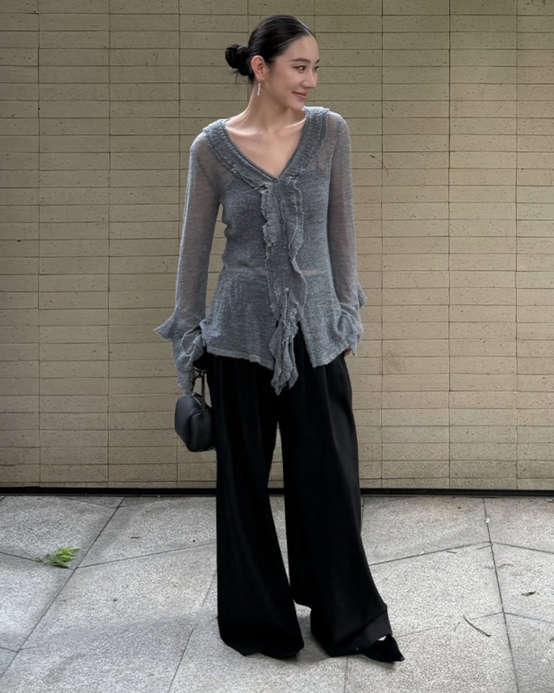 #フリルニット #Vネック #グレーニット #フェミニンコーデ #ニュアンスカラー #フレアスリーブ
