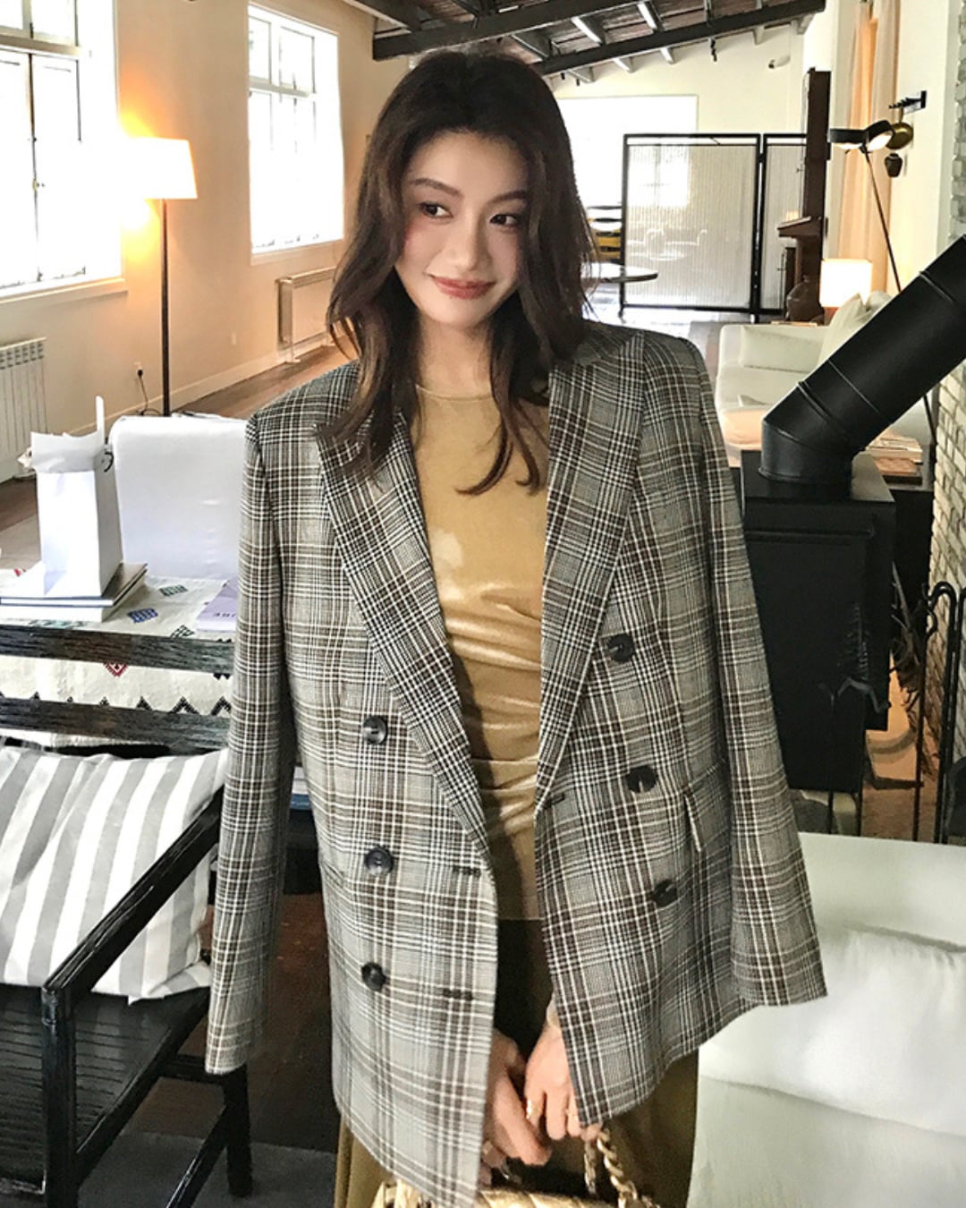 トラッドなムード漂う千鳥格子のダブルブレストジャケット。柔らかくもしっかりとした厚みのある生地感で秋冬にぴったり。大きめのラペルやゴールドボタンが上品さを引き立て、どんなスタイルにもマッチする万能アイテムです。デニムやワンピースにさらっと羽織るだけでこなれ感がアップ。