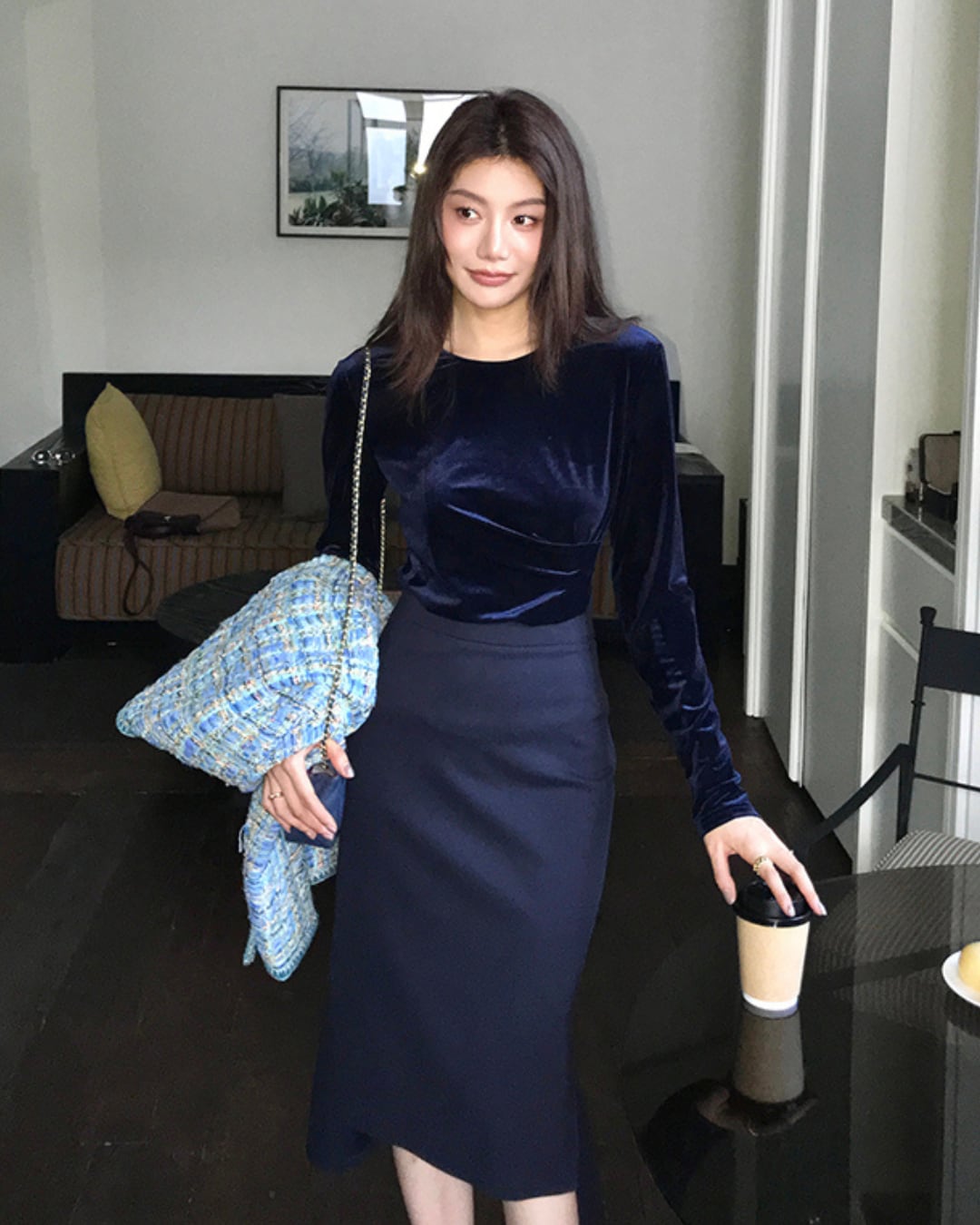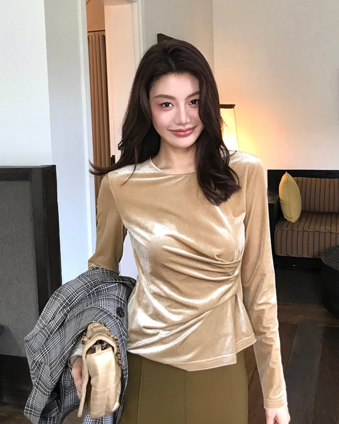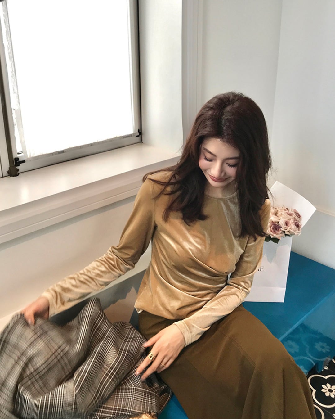 上品な光沢感とドレープが美しい、ストレッチベロアの長袖トップス。ウエスト部分に施されたアシンメトリーなギャザーが、立体感のあるシルエットを演出。シンプルながらも存在感があり、1枚で華やかに着映えるデザイン。デニムやスラックスと合わせて、デイリーにもオケージョンにも◎