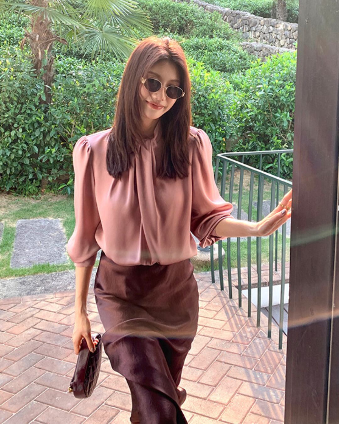 しっとりとした落ち感が美しい、上品な光沢サテンブラウス。フロントのタックディテールと、首元のスリットがさりげない女性らしさを演出。とろみのある素材が動くたび柔らかく揺れ、ボトムインでもアウトでもバランスよく着こなせる一枚。スラックスやデニムと合わせてデイリーにもオフィスにも◎