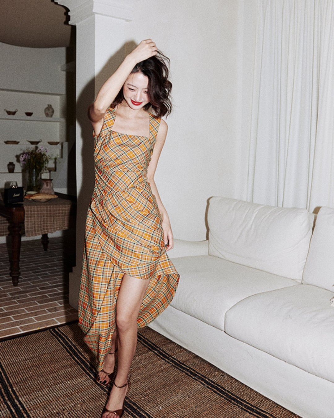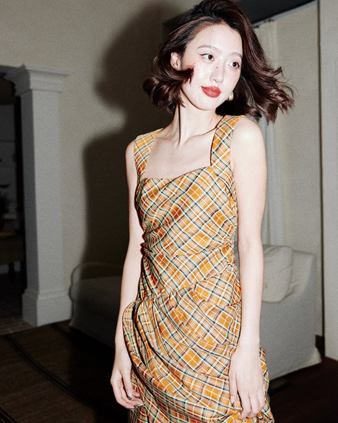 #スクエアネック #ドレープデザイン #オレンジチェック #ウエストマーク #ロングワンピース #ノースリーブ