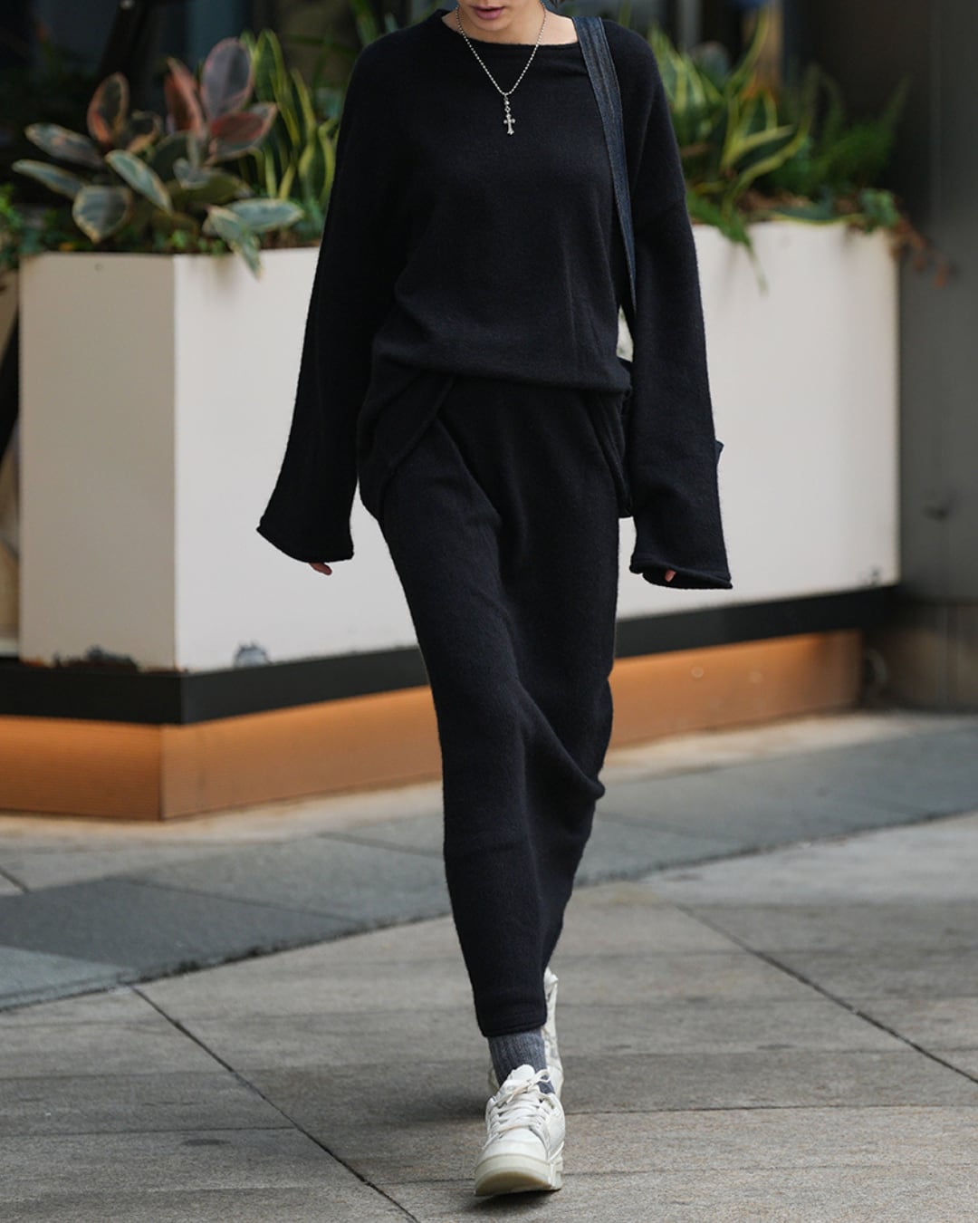 ゆったりとしたルーズシルエットが魅力のラウンドネックニットセットアップ。程よく厚みのある柔らかな素材感で、快適な着心地を実現。シンプルながらも洗練されたスタイルが、大人のカジュアルコーデにぴったりの一着です。