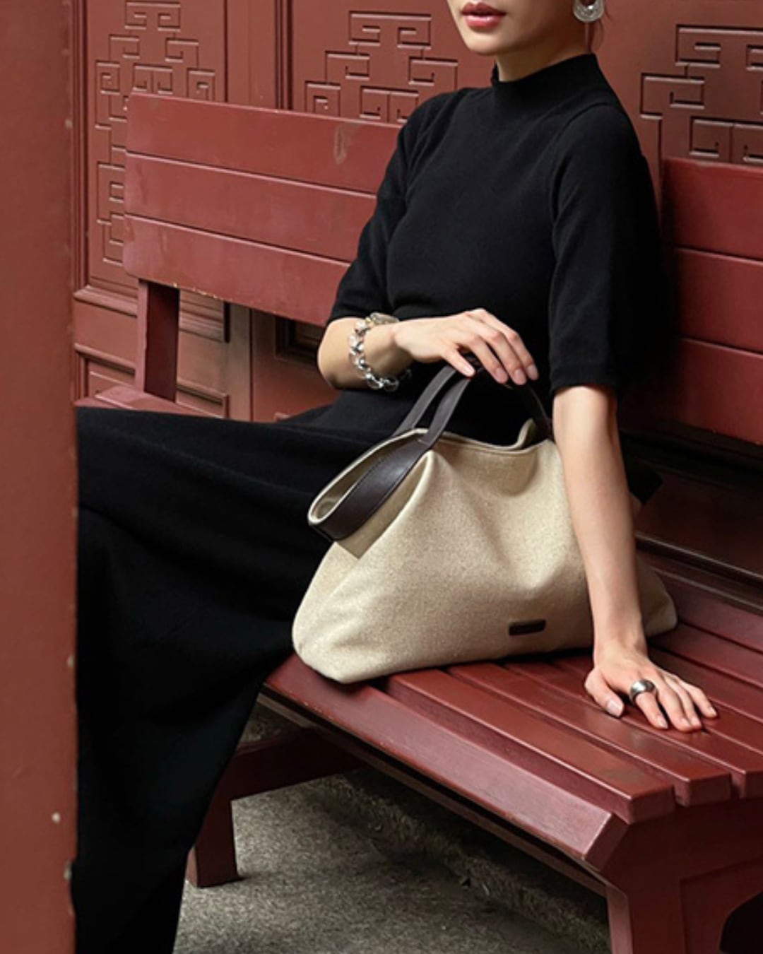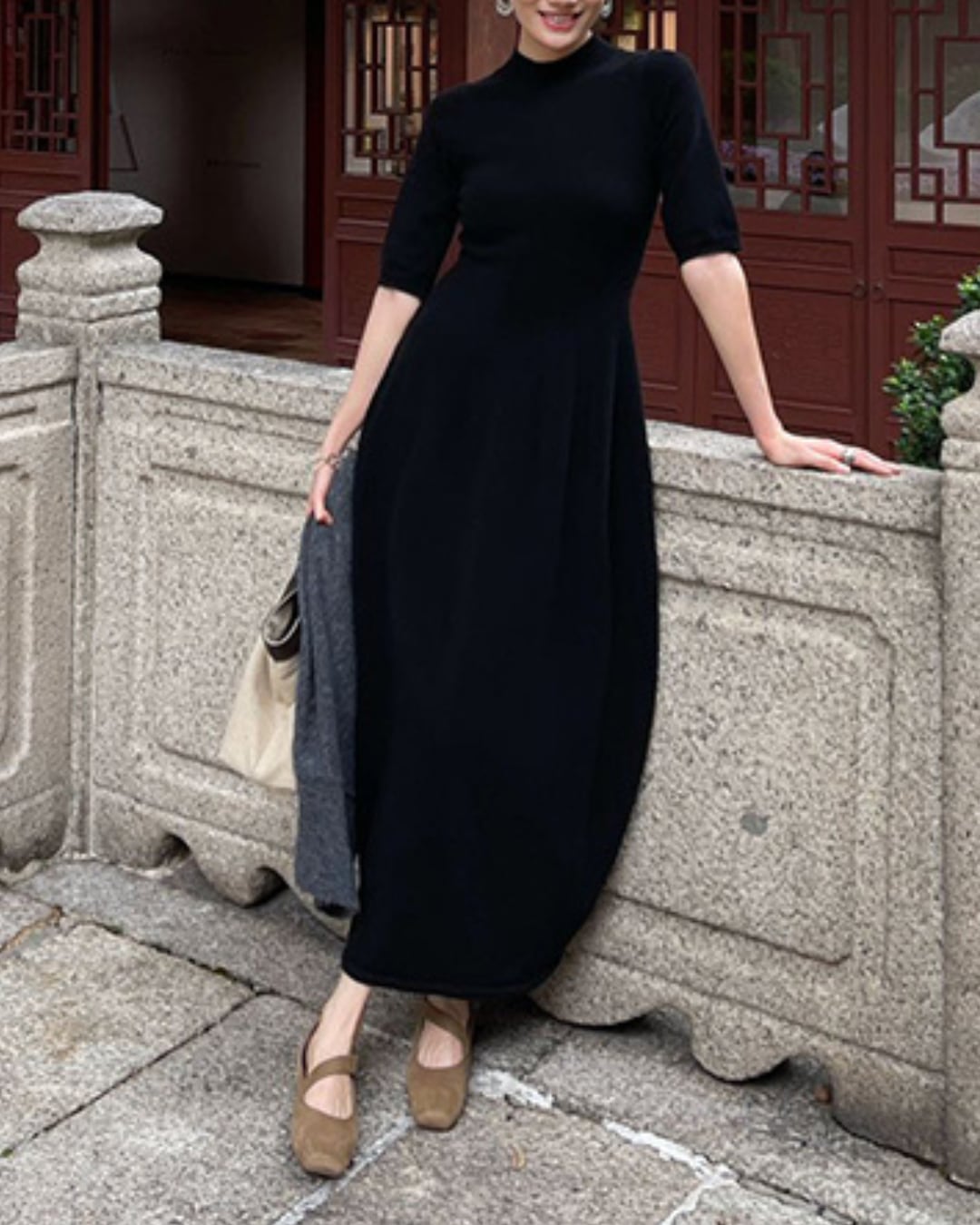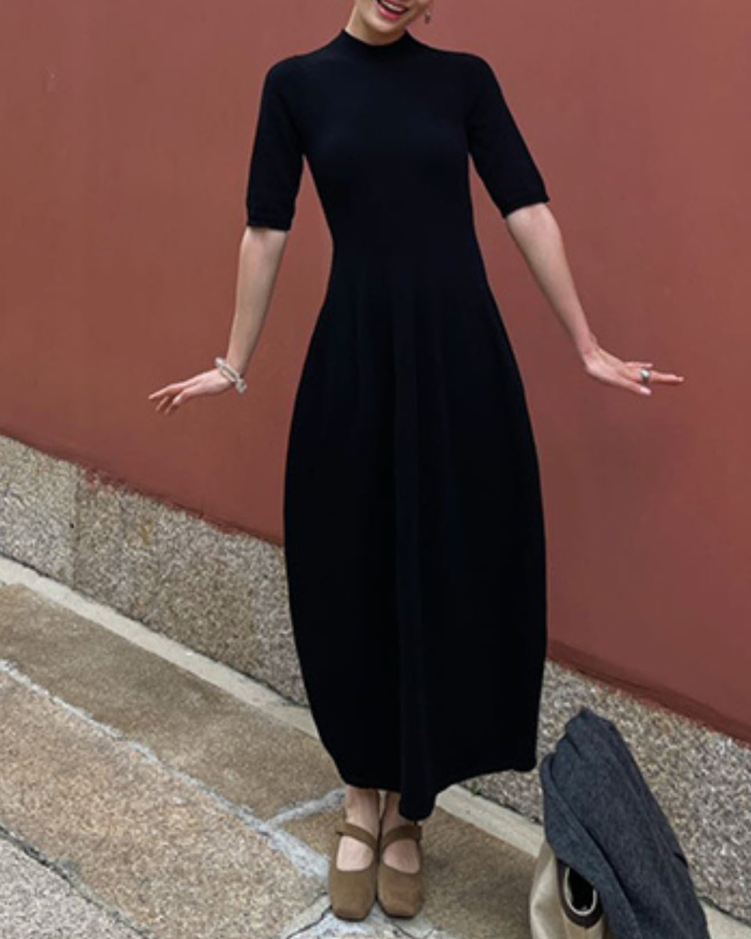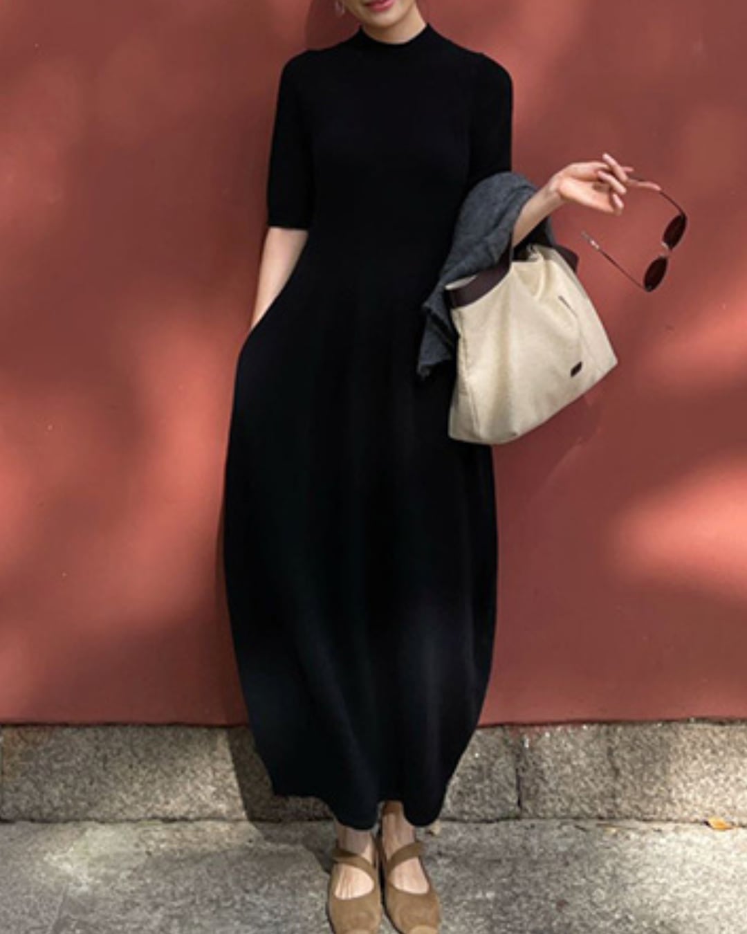上品なブラックカラーで大人の女性らしさを引き立てる、コットンウール素材の花苞シルエットワンピース。やわらかく肌なじみの良い生地感と、半高ネック・五分袖のデザインがクラシックな雰囲気を演出。一枚でも様になり、秋冬のレイヤードスタイルにも最適な一着です。