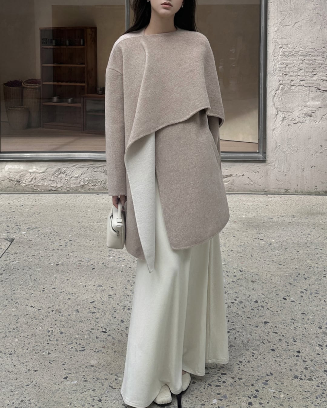 上品なAラインシルエットと、裾にかけて広がるマーメイドデザインが魅力のニットスカート。ダブルレイヤー仕立てで立体感のあるシルエットが動きに合わせて揺れ、女性らしい雰囲気を演出します。美しく見せながらも快適な穿き心地で、通勤やデイリーにもおすすめの一着。