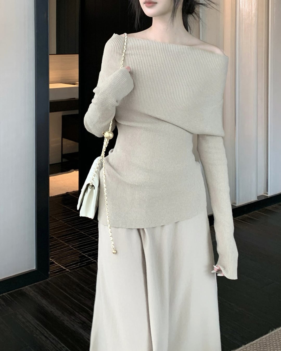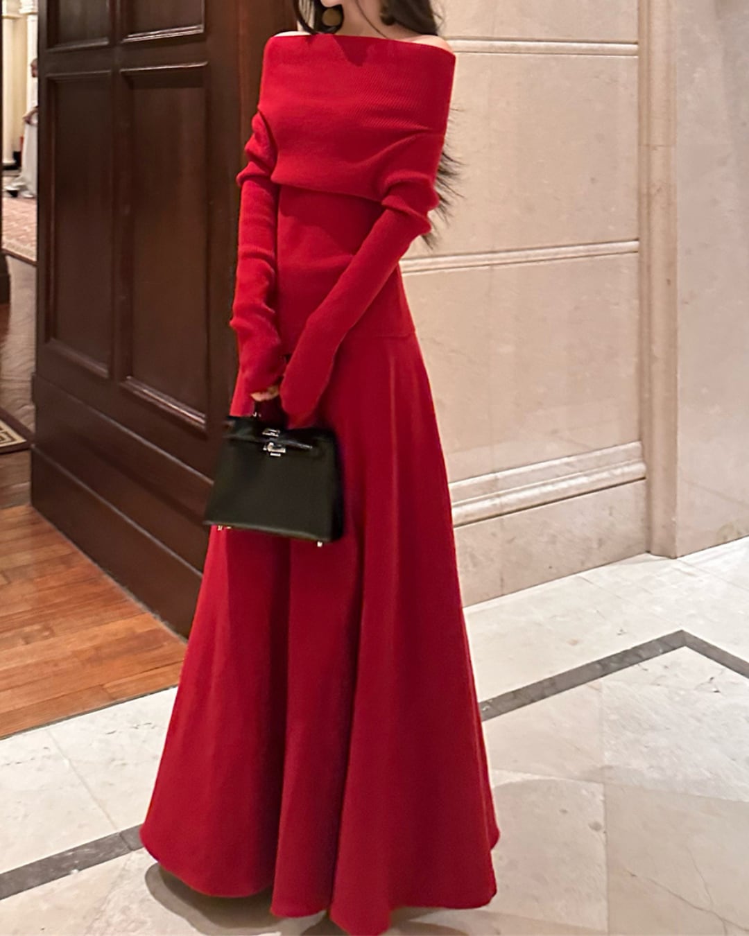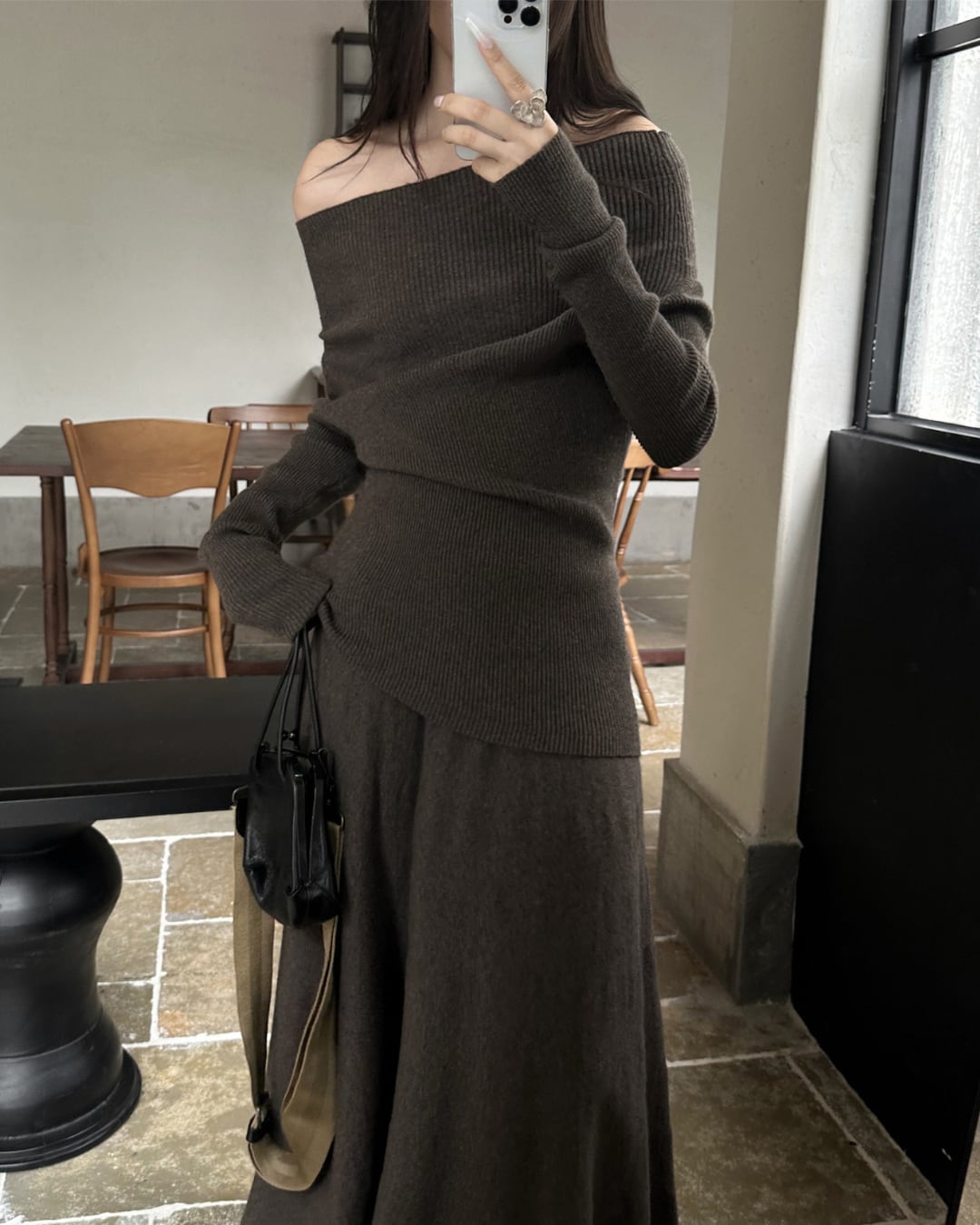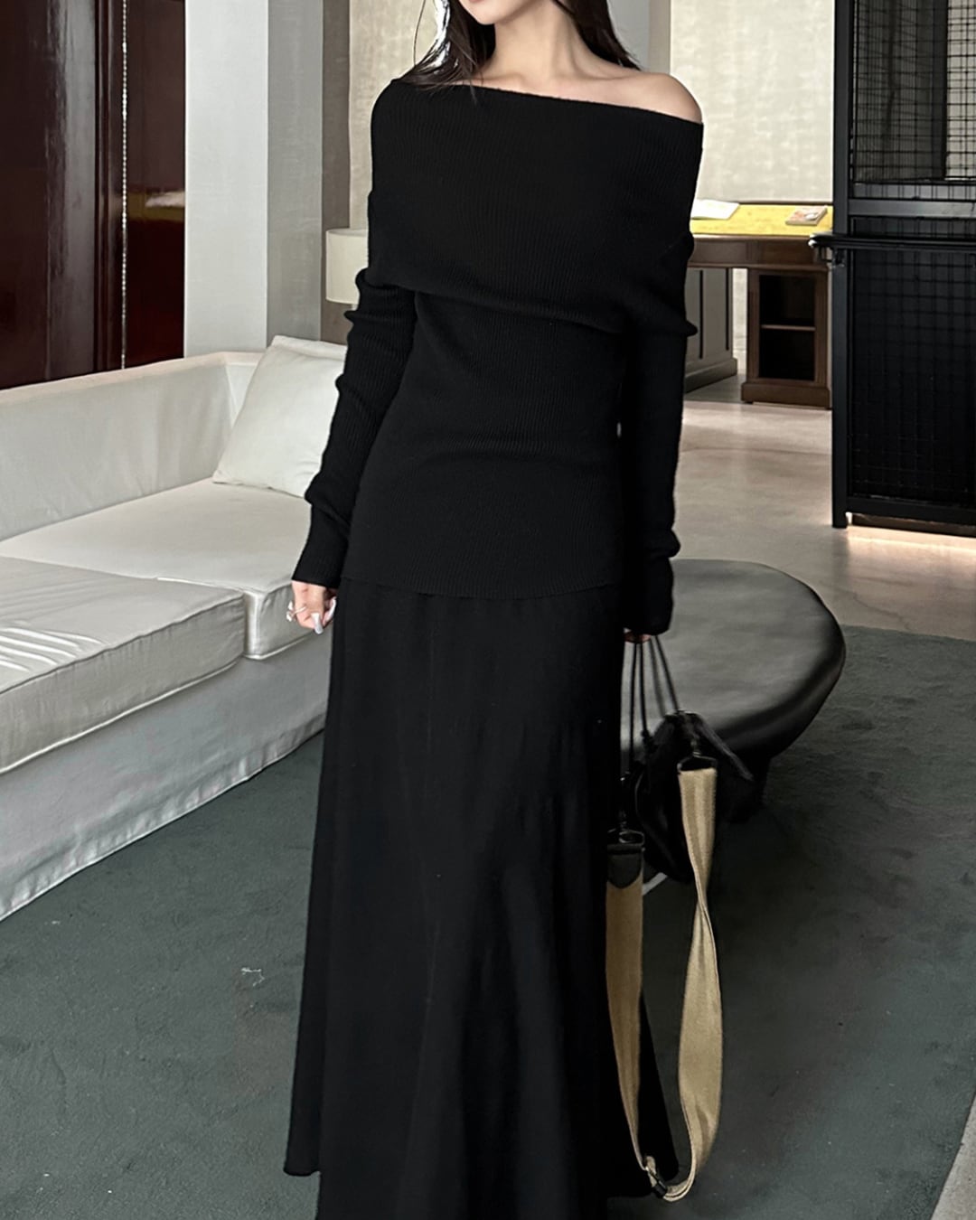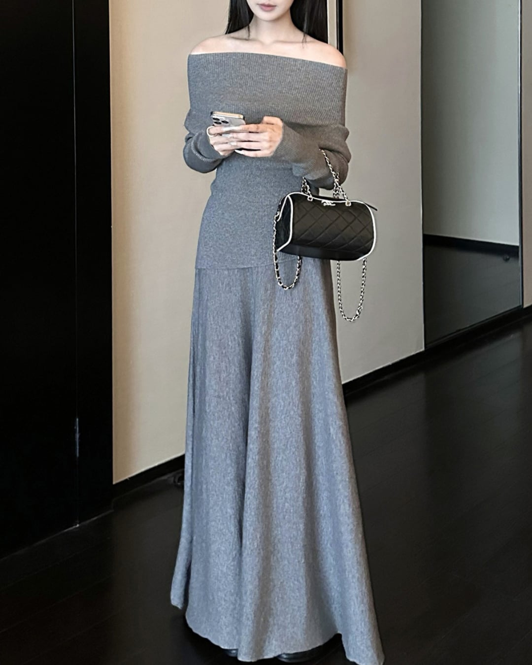美しいフィット感と落ち感が魅力のニットセットアップ。デコルテをすっきり見せるボートネックトップスと、たっぷりと広がるロングスカートが優雅なシルエットを演出。それぞれ単体でも使える汎用性の高さで、秋のワードローブにぴったりの一着です。