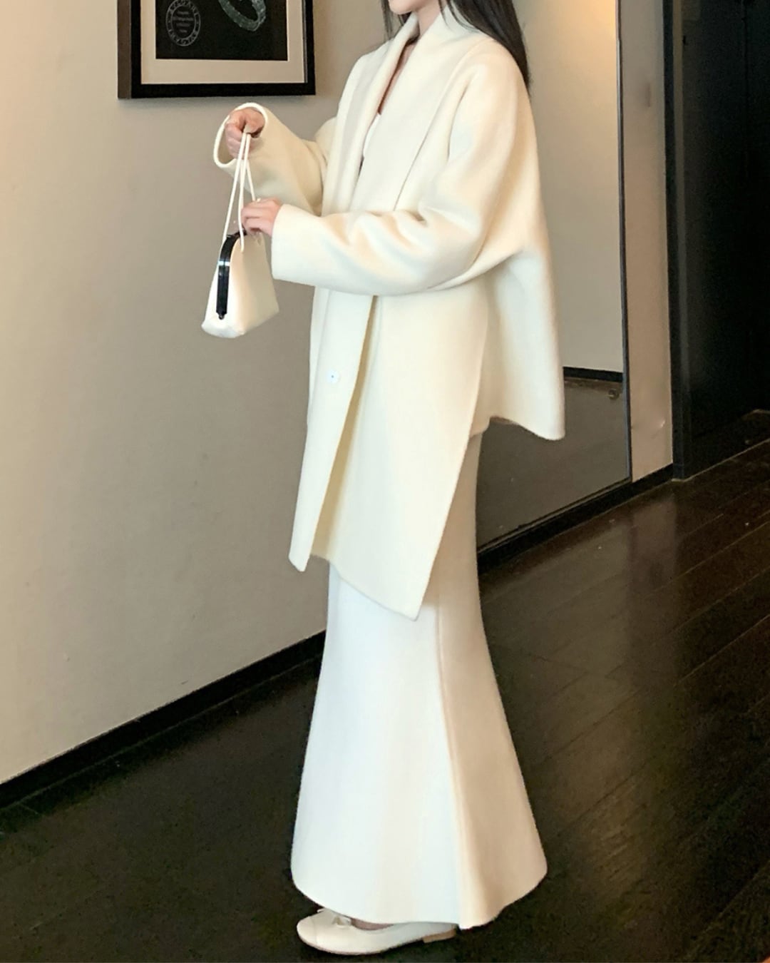 #アシンメトリー #ドレープコート #構築的シルエット #アイボリーコーデ #モードコーデ #ミニマルアウター