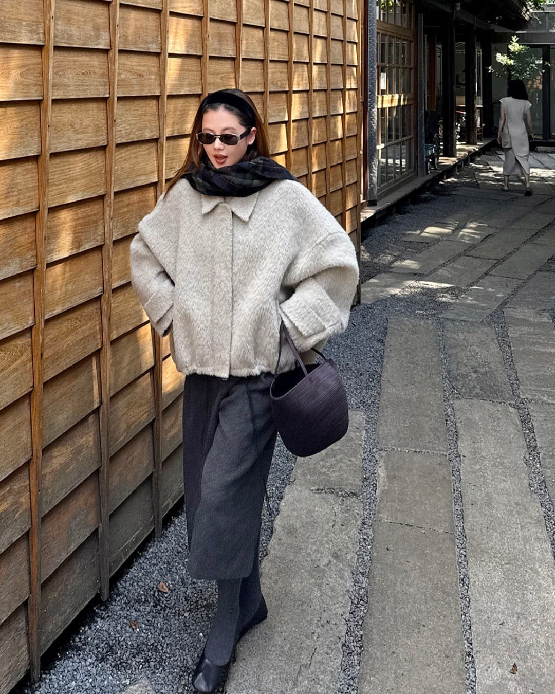 ボリューム感のあるショートジャケットと相性抜群のワイドストレートパンツ。自然なハイウエストデザインで、ゆったりとしたシルエットが魅力。落ち着いたチャコールグレーで、秋冬のスタイルを品よく引き締めてくれます。