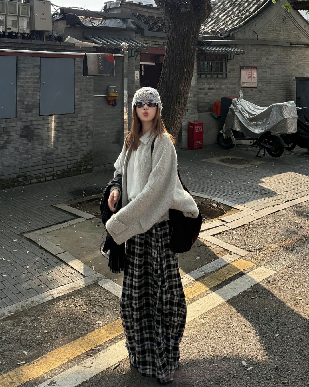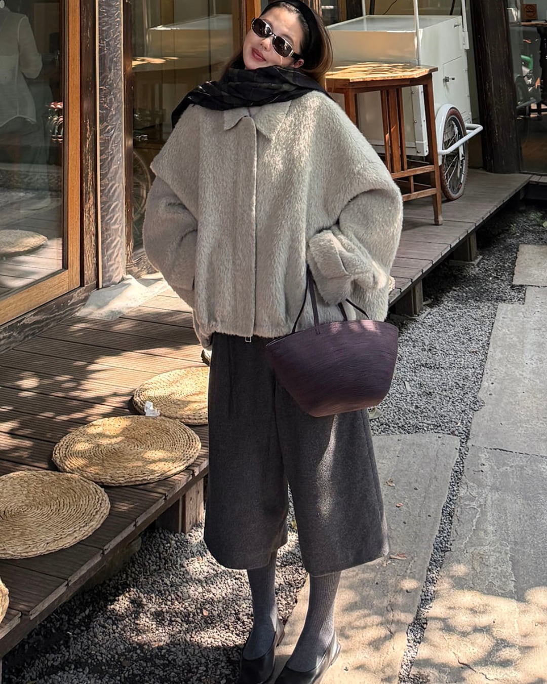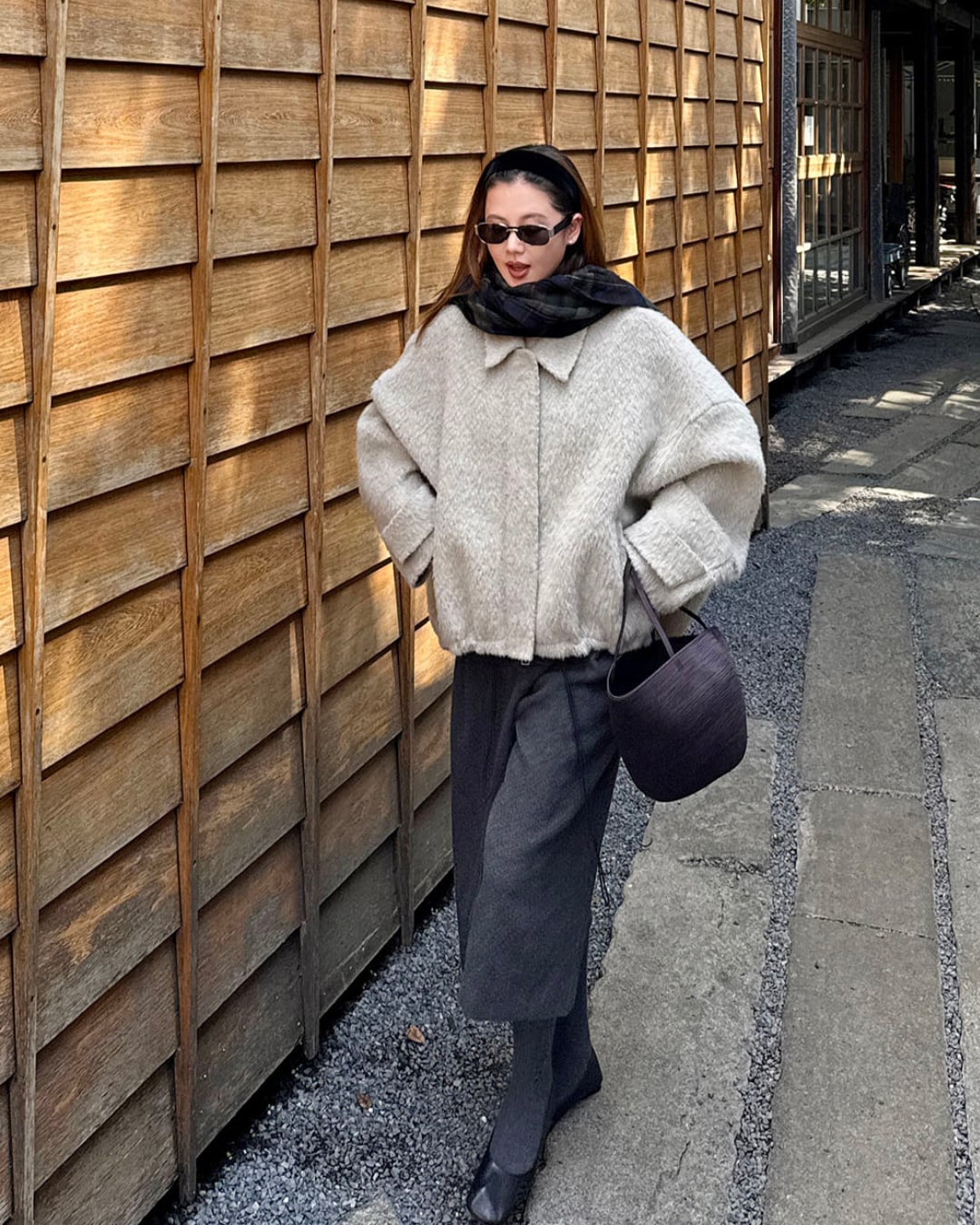 #ウールジャケット #ショートアウター #オーバーサイズ #ダブルフェイス #秋冬コーデ #オートミールカラー #ボリューム襟 #立体シルエット