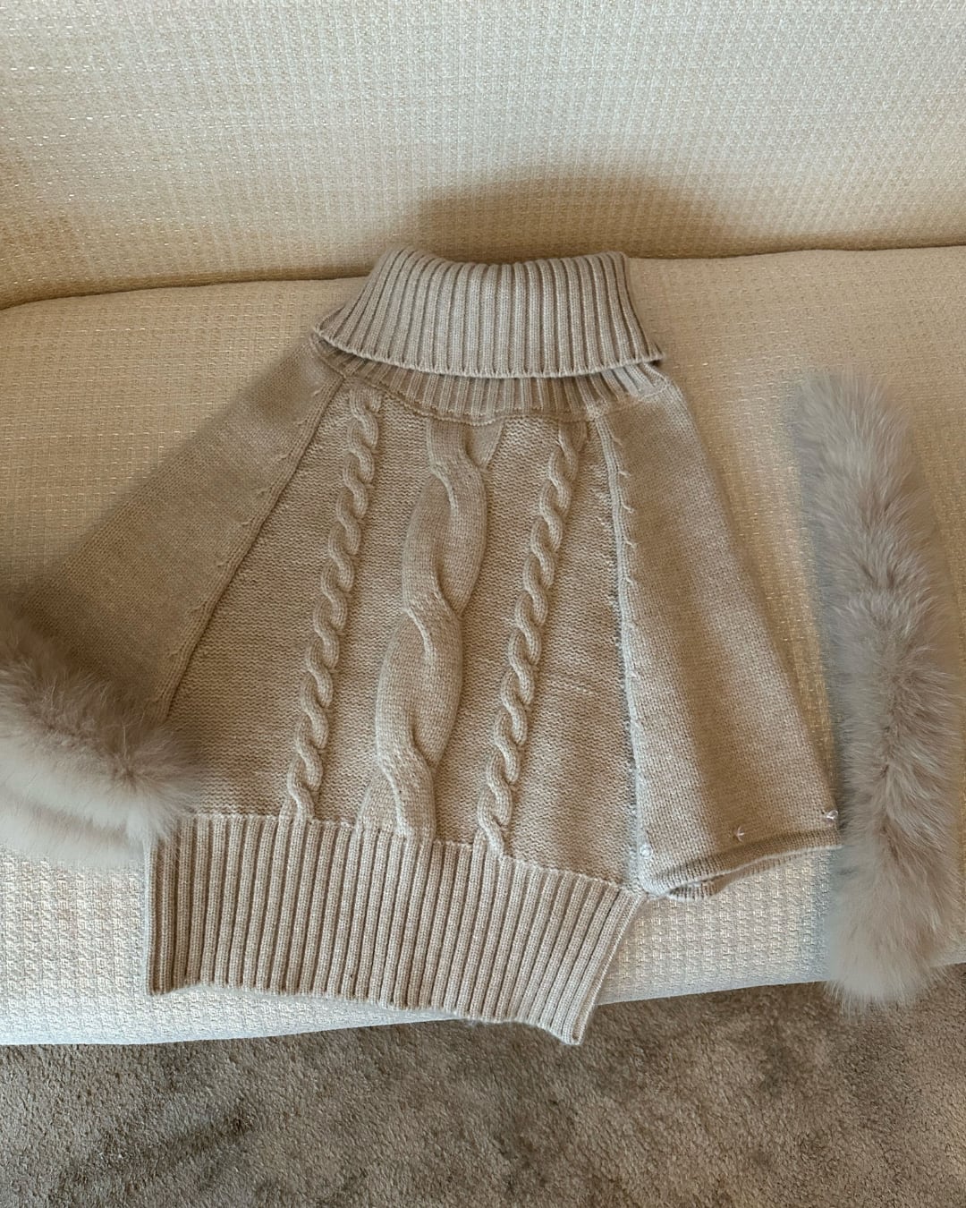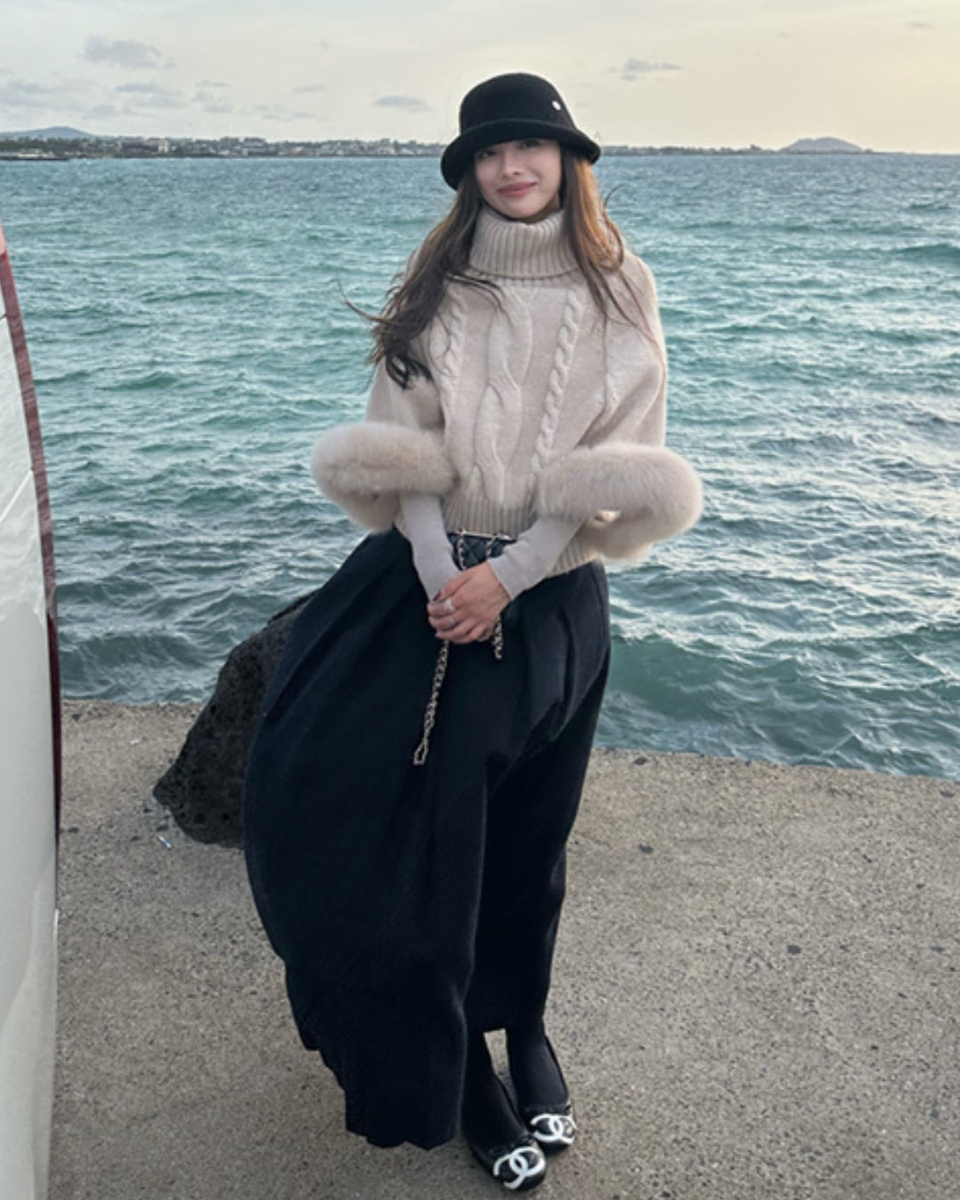 ふんわりとしたフォックスファーが袖口を彩る、上品なケーブル編みニット。立体感のあるハイネックデザインが首元を優しく包み、防寒性も◎。程よいショート丈でボトムスを選ばず、ワイドパンツやスカートとの相性も抜群。秋冬コーデを格上げしてくれる、高級感漂う1枚です。