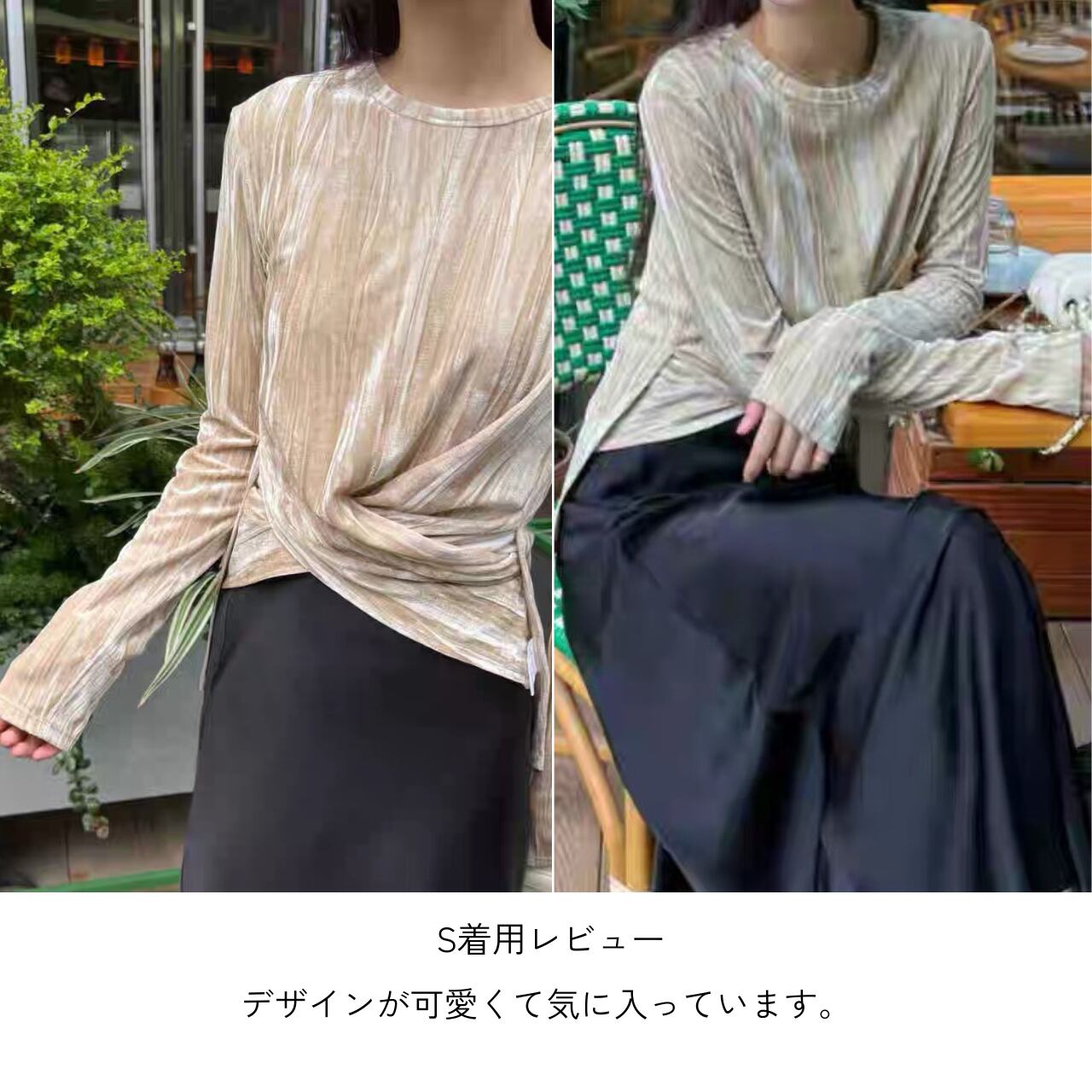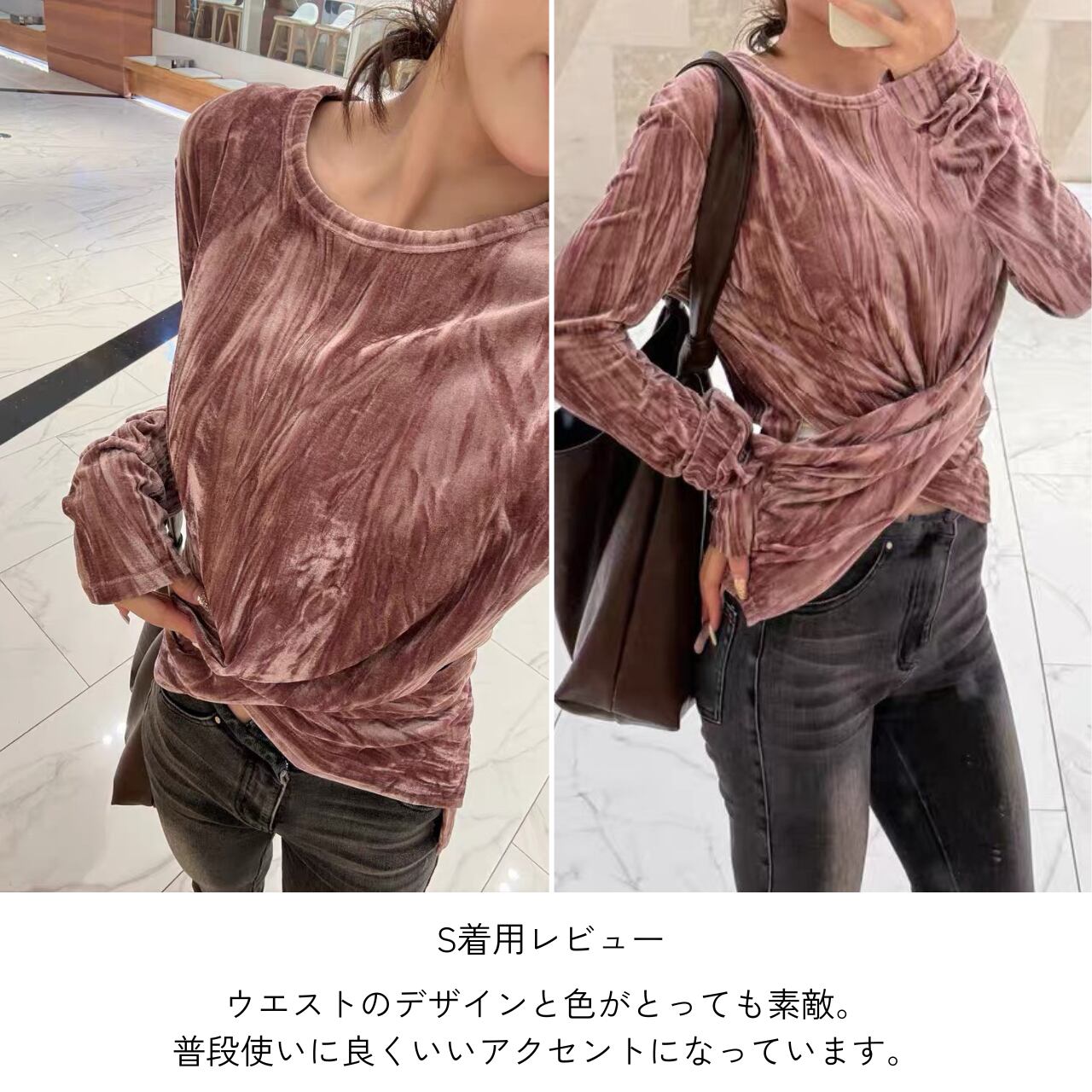 上品な光沢が目を惹くベルベット調トップス。立体的なクロスデザインがウエストラインを美しく見せ、着るだけでスタイルアップ効果も◎柔らかく伸縮性のある素材で着心地も抜群。スカートやワイドパンツと合わせることで、大人フェミニンな装いに仕上がります。日常から特別なシーンまで着回せる優秀アイテムです。