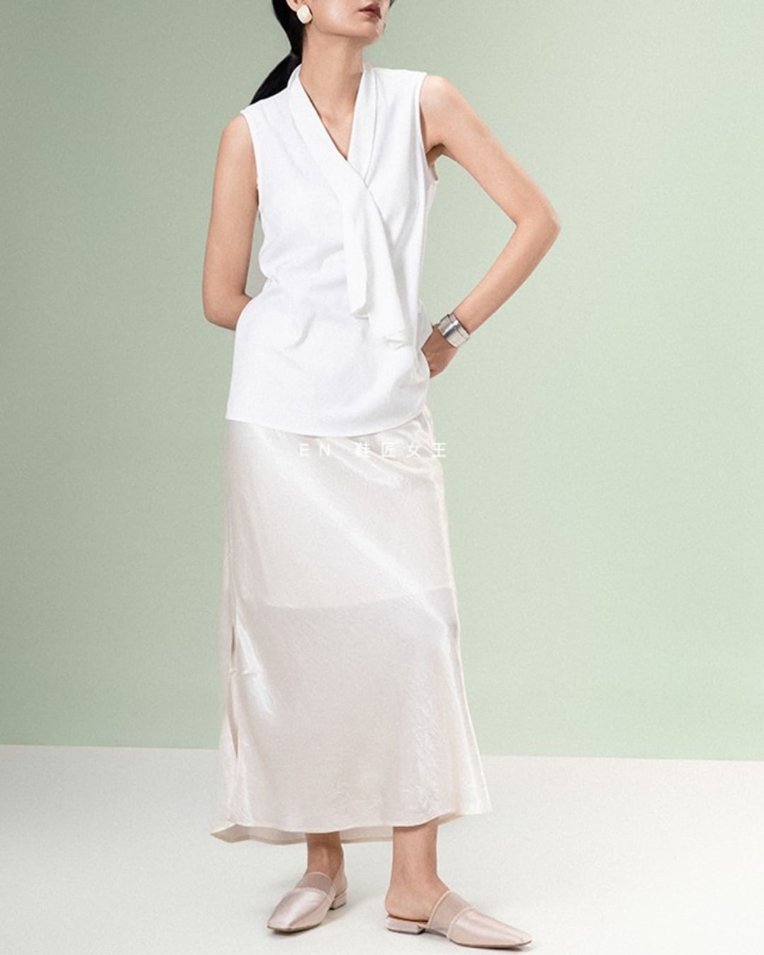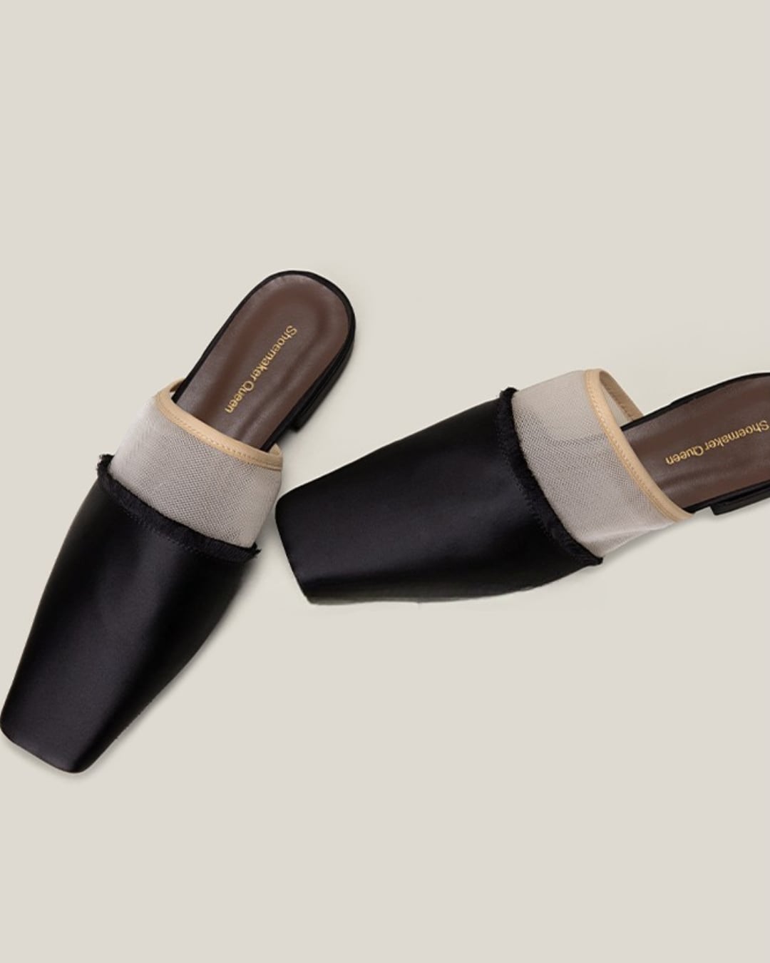 シルクのような上質な光沢感と、シースルーメッシュのコンビが魅力のフラットミュール。程よいスクエアトゥと2cmの低ヒールが上品さを演出しつつ、快適な履き心地を叶えます。イタリア水染めの上質なシープスキンライニングが足元に高級感を添える一足です。リラックス感とエレガンスを両立させたデザインで、カジュアルにもキレイめにも好相性◎
