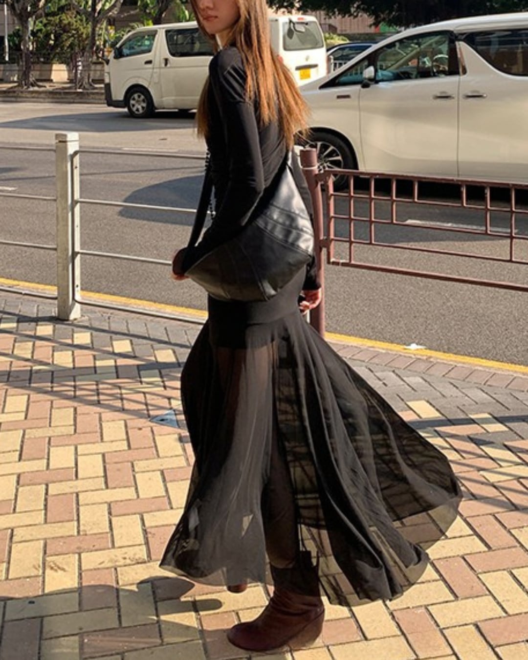 異素材の切り替えデザインが目を惹く、大人の洗練ムード漂うマーメイドワンピース。上半身はしなやかにフィットし、スカート部分は軽やかに広がるシアー素材で仕上げ、視覚的なコントラストと抜け感をプラス。モード感と女性らしさを両立した一着です。シンプルなのに印象的なシルエットで、1枚で主役になるアイテム。