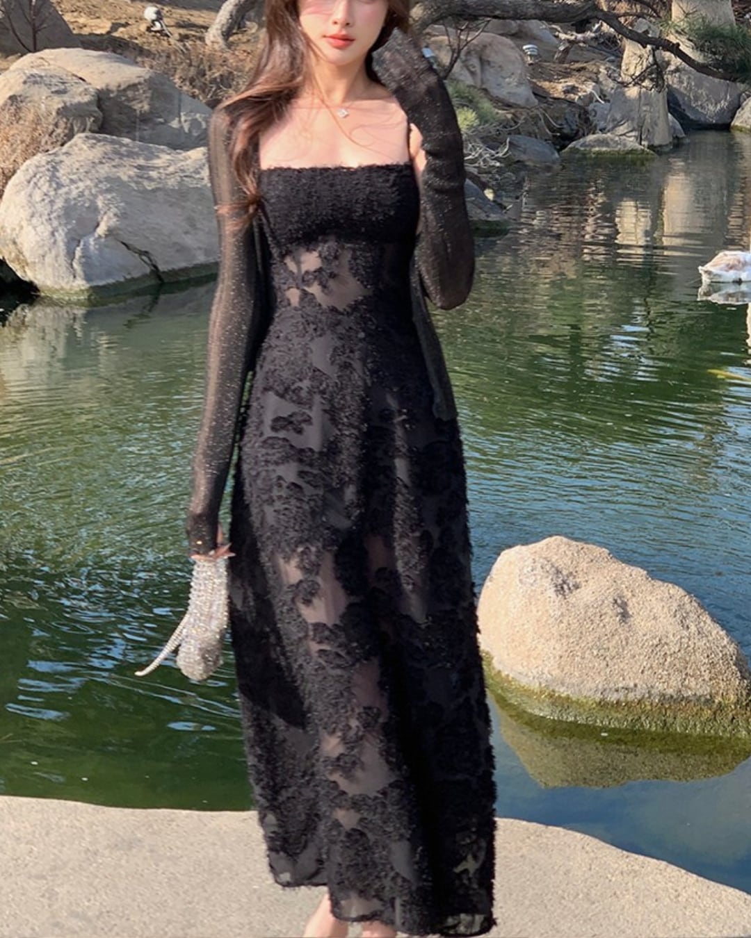 #シアーワンピース #ブラックコーデ #フロッキードレス #フォーマルドレス #ロングワンピース