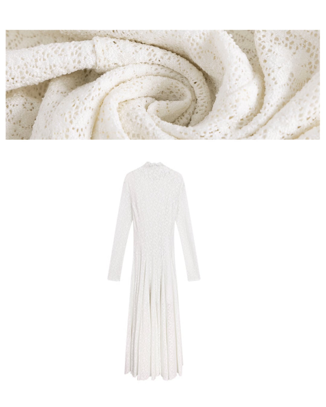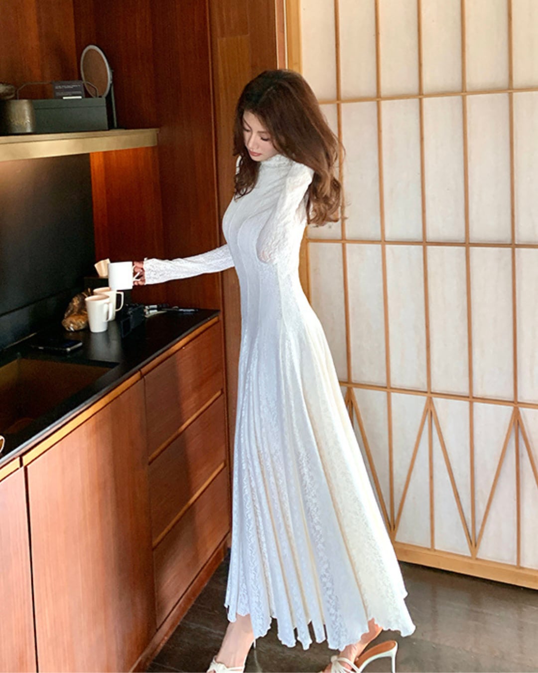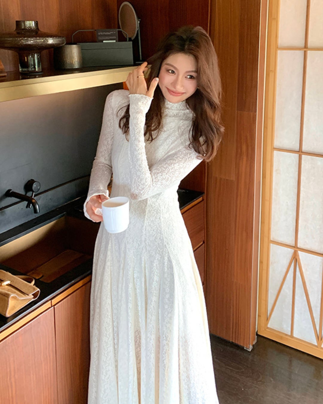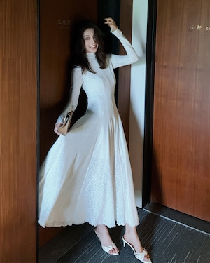 #レースワンピース #アイボリーワンピ #フレアスカート #ハイネックドレス #12枚接ぎ #ロング丈ワンピ #エレガントコーデ #ドレスアップコーデ