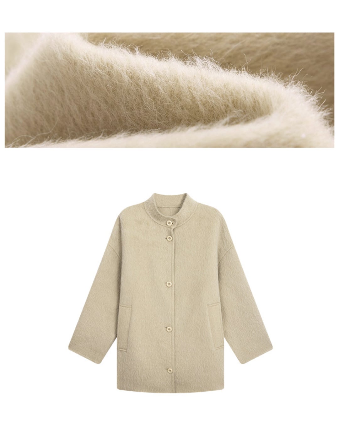 柔らかく起毛感のある素材で仕立てた、スタンドカラーのミドル丈コート。ウール60%混でしっかりと保温性がありながら、40%のソフトポリエステルが軽やかさと滑らかな肌触りを実現。肩を落としたゆったりシルエットで、抜け感のあるリラックススタイルに。細部のステッチやボタン、ポケットの仕上げも丁寧で、高級感のある仕上がり。カジュアルにもきれいめにも合わせやすく、秋冬にぴったりの一着です。