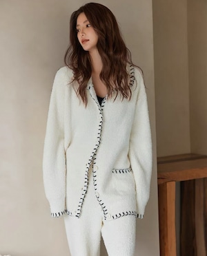 ふんわり柔らかいボアタッチ素材で仕上げた、カーディガンタイプのルームウェアセット。落ち感のあるゆったりシルエットと配色ステッチが大人の抜け感を演出。シンプルで上品なデザインは、おうち時間はもちろんワンマイルウェアとしても◎