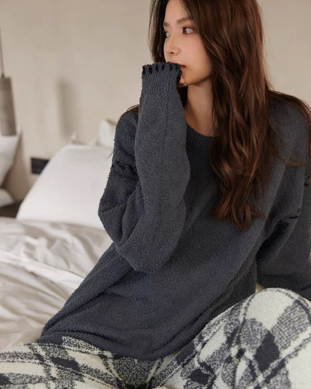 秋冬にぴったりのふわふわチェック柄ルームウェア。トップスはゆったりシルエットのプルオーバー仕様。パンツはストレートシルエットで美脚見え&おうち時間にぴったりなあたたかさ◎肌当たりも柔らかく、保温性も抜群です。