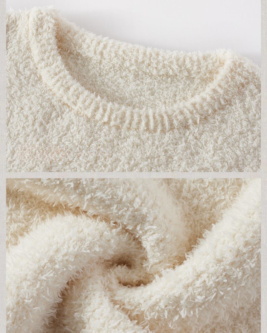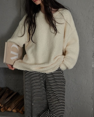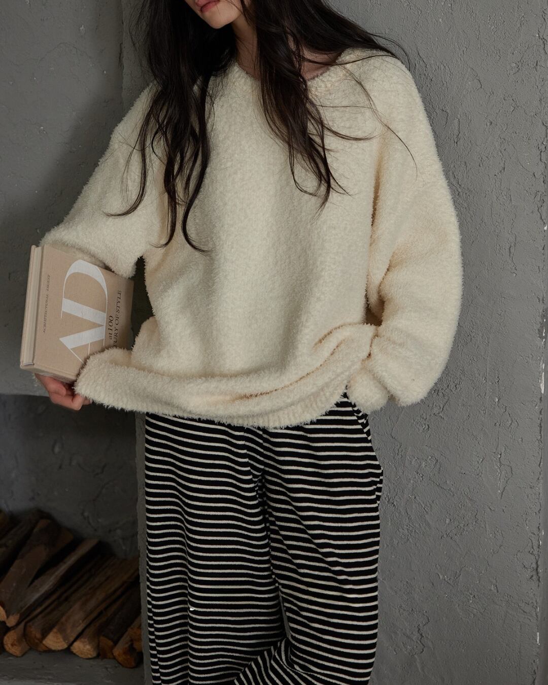 超ソフトな肌触りのボア素材で仕上げた、ミニマル&上品なルームウェア。ゆったりワイドなシルエットとシンプルなクルーネックが特徴で、抜け感あるスタイルに。おうち時間はもちろん、ワンマイルウェアとしても活躍する1枚です。