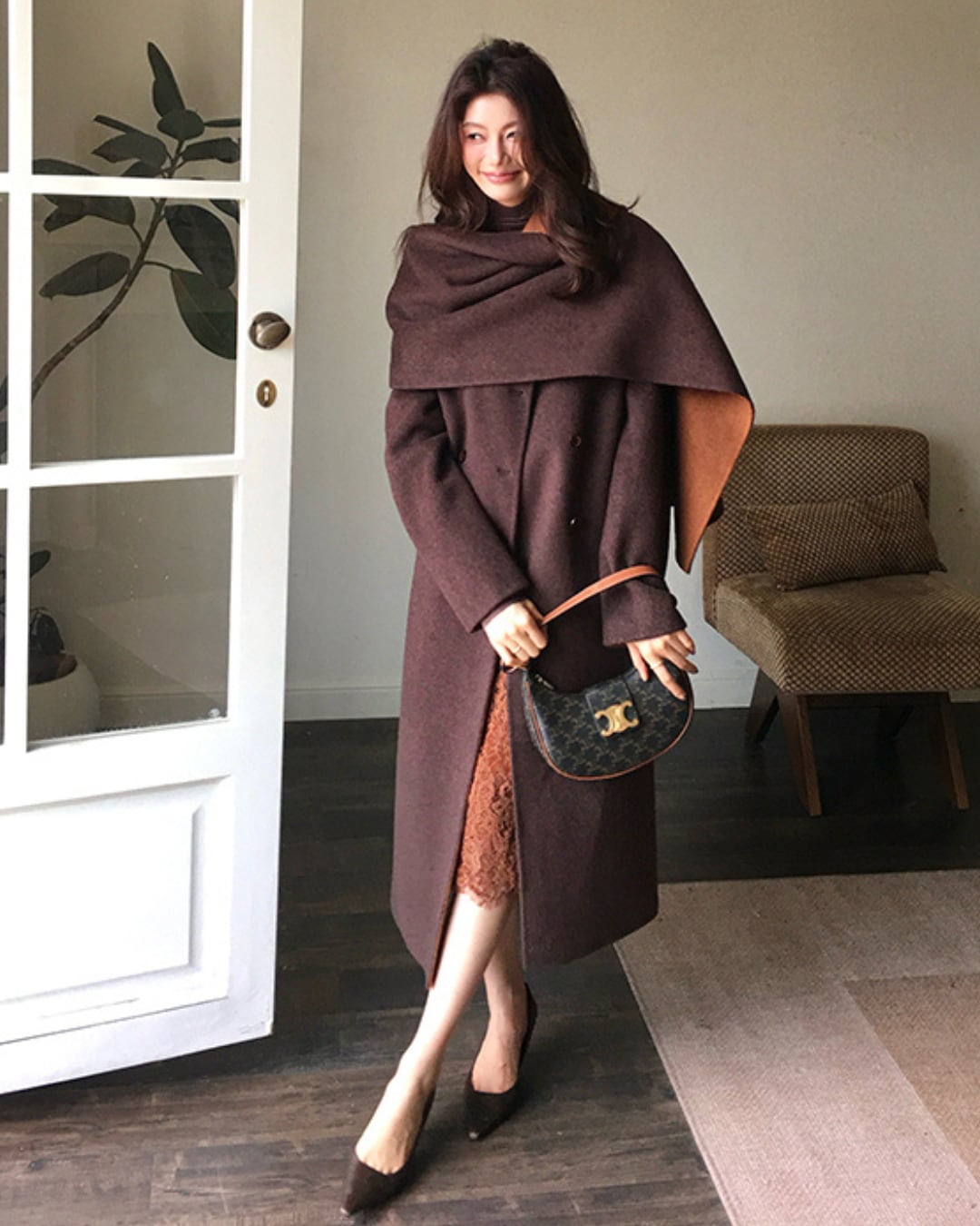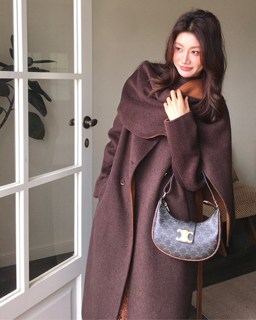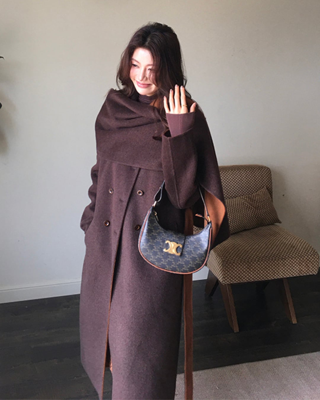 立体感のあるケープデザインが目を惹くロング丈のウールコート。柔らかく高級感のあるウール混素材で仕立てられ、身体を包み込むようなあたたかさ。存在感がありながらも落ち着いたブラウンカラーで、上品に仕上がる一着です。フロントはダブルボタン&共布ベルト付きでスタイルアップ効果も◎