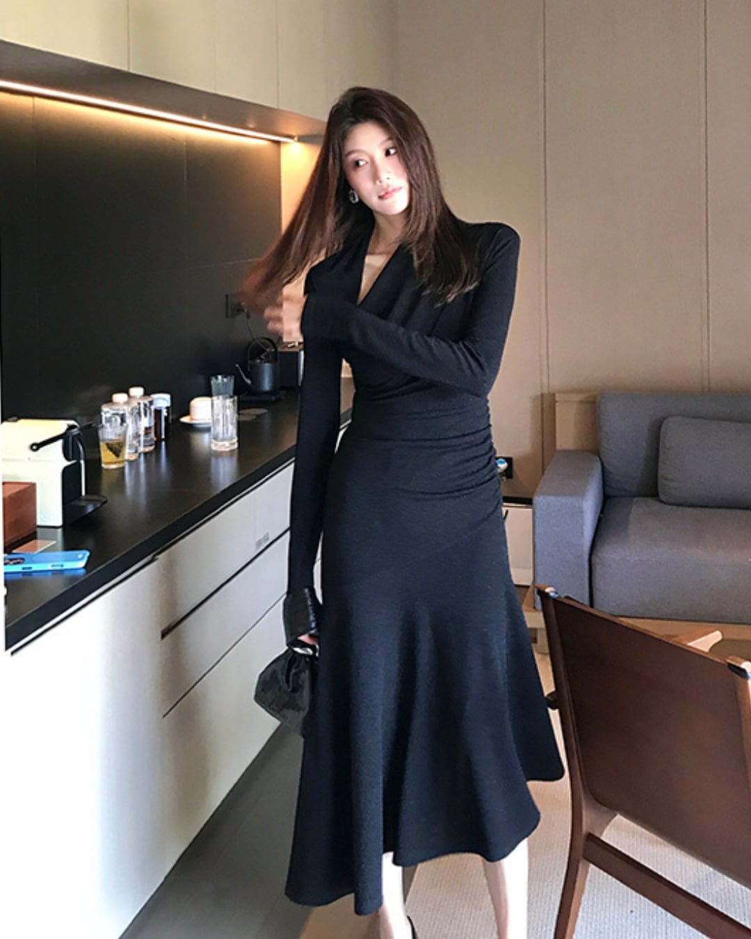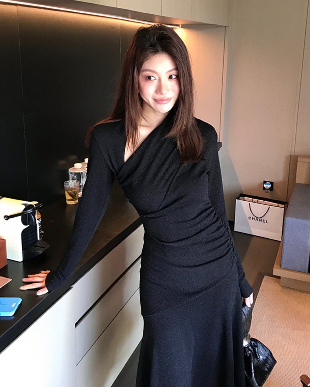 美しいシルエットと計算されたドレープが魅力のミディ丈ワンピース。ウエストのギャザー切替が自然にくびれを演出し、女性らしいラインを引き立てます。裾はアシンメトリーカットで歩くたびに揺れるエレガントなデザイン。柔らかくストレッチの効いた素材で、快適な着心地も魅力です。