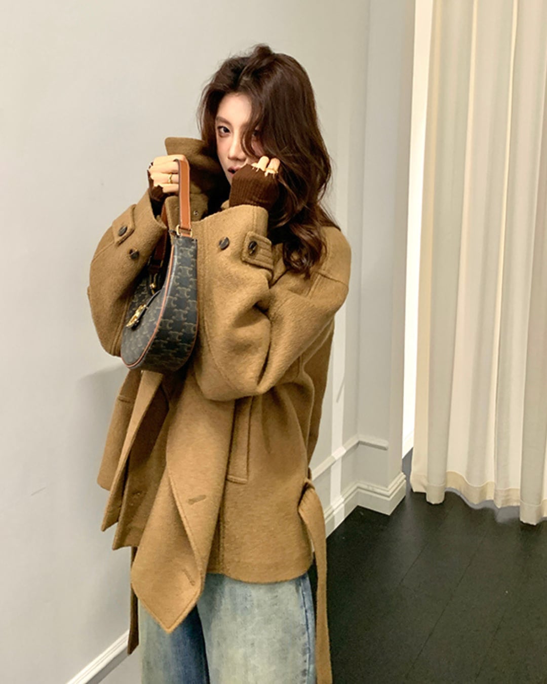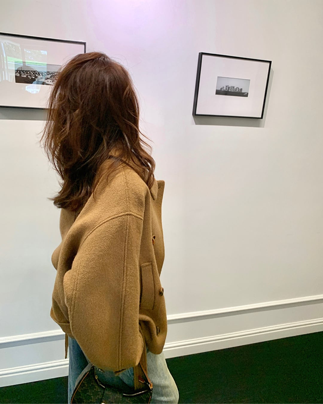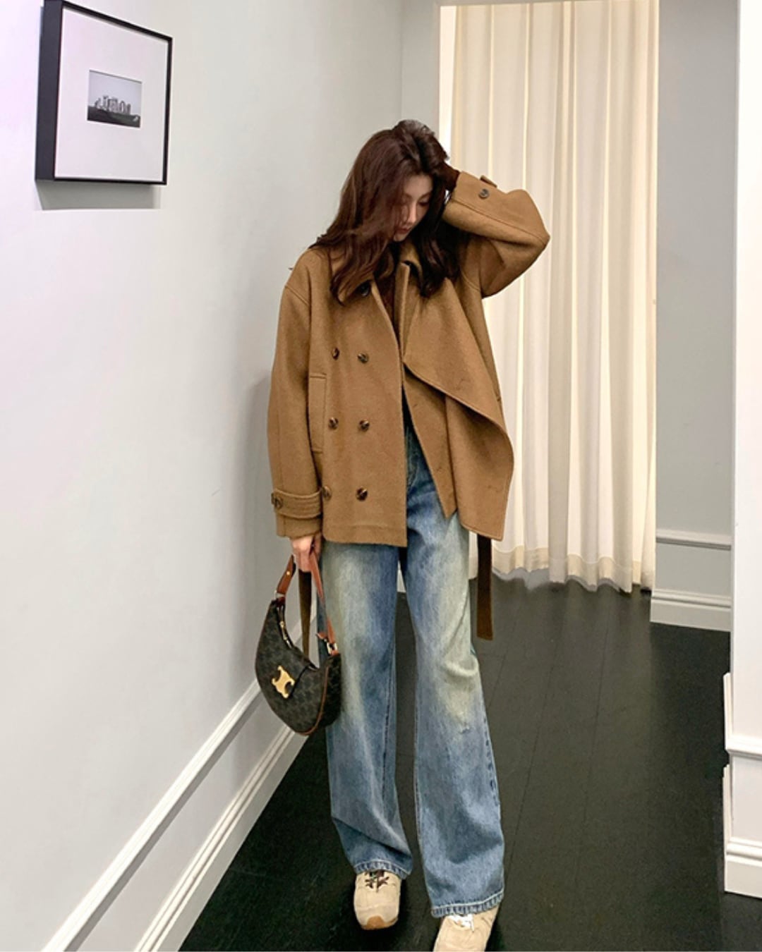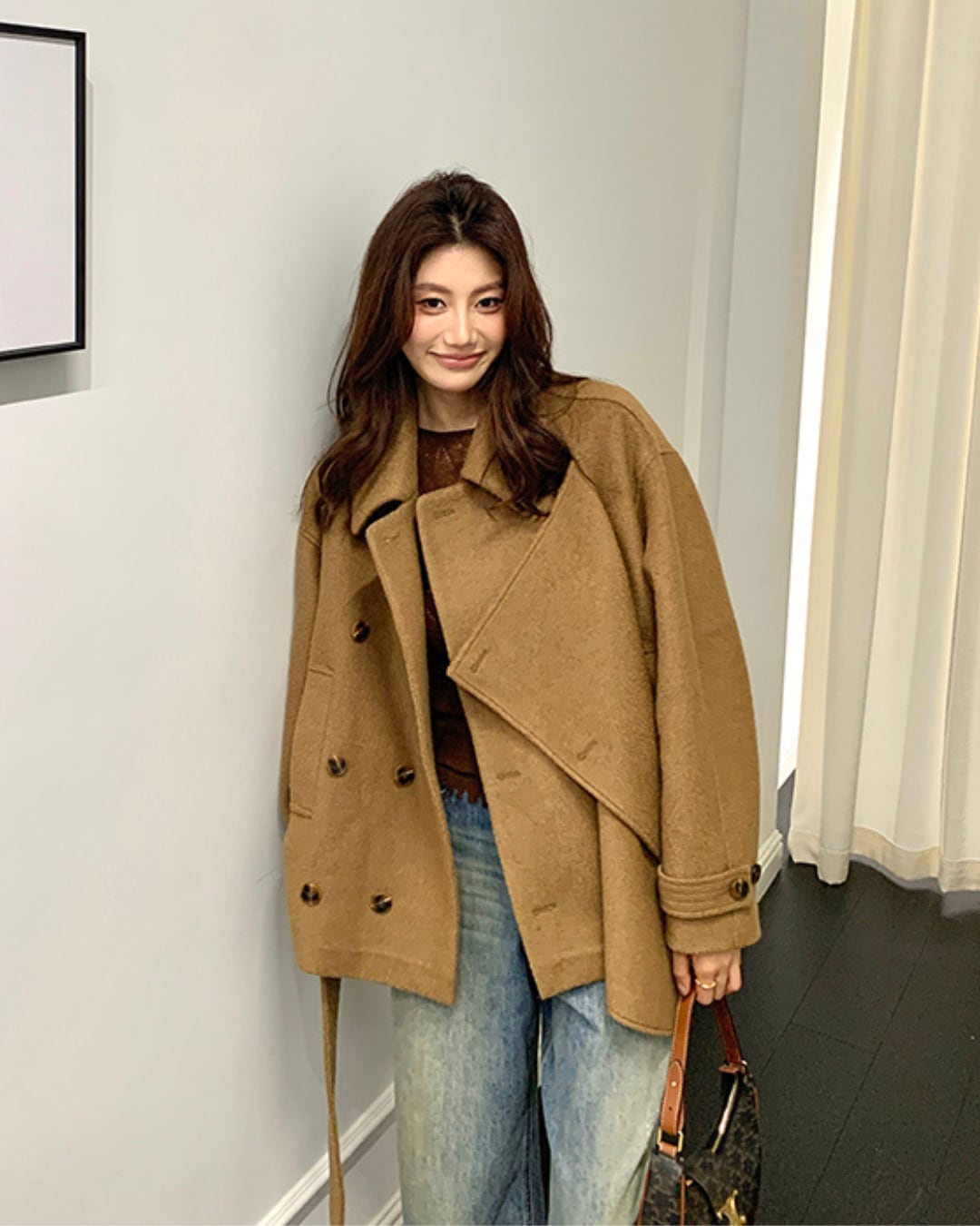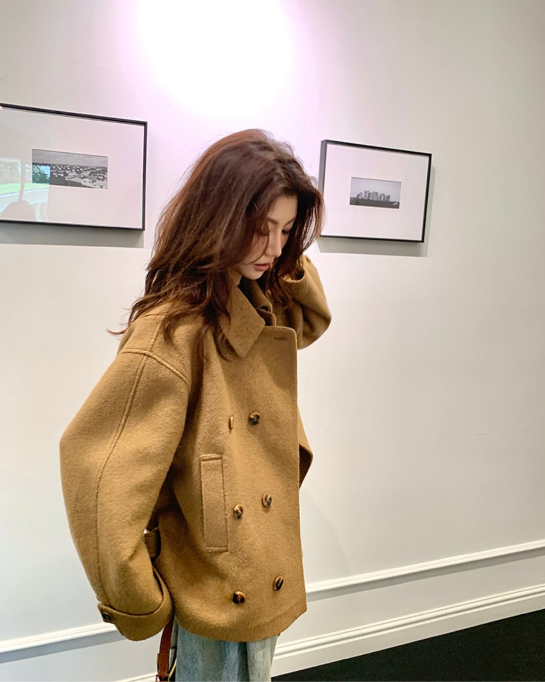 トラッド感あるダブルボタンと大きめの襟デザインが印象的な、ゆったりとしたシルエットのショート丈ウールコート。厚手すぎないダブルフェイス仕様で、重ね着もしやすくロングシーズン活躍◎落ち着いたカーキがトレンドの“メラードコーデ”にもぴったり。