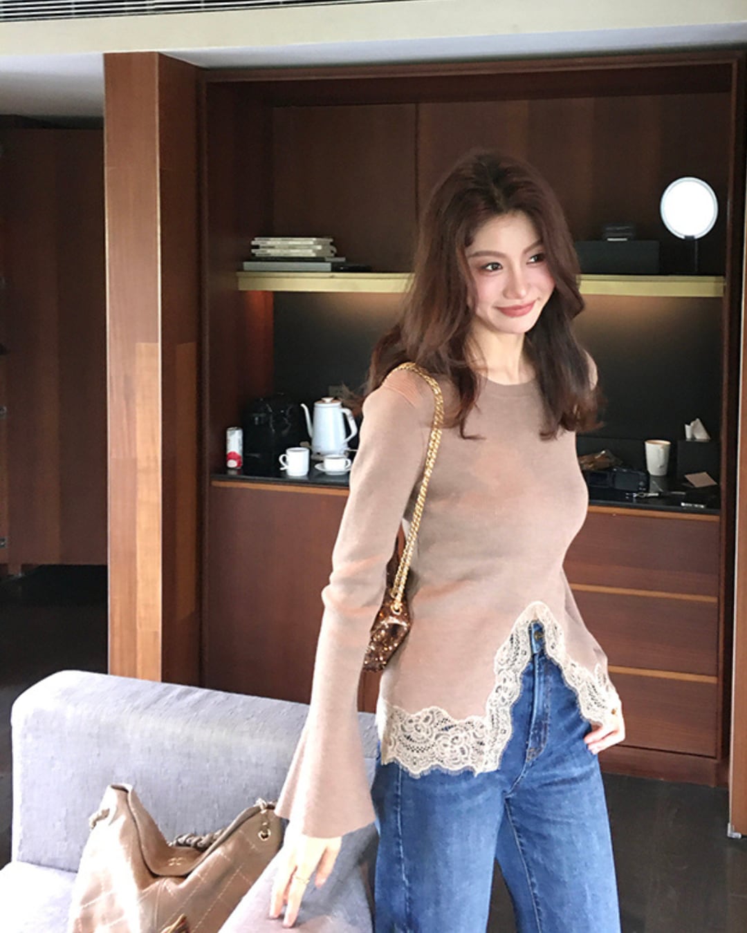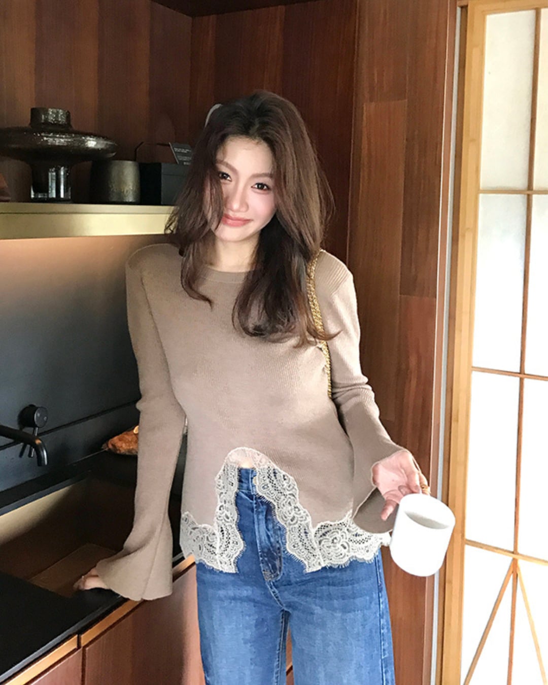 裾のレースデザインが華やかさを添える、フィット感のあるリブニットトップス。柔らかく伸縮性のあるニット素材で、身体のラインに美しくフィット。袖口のフレアデザインが女性らしさを引き立て、カジュアルからきれいめまで幅広く着回せる一枚です。