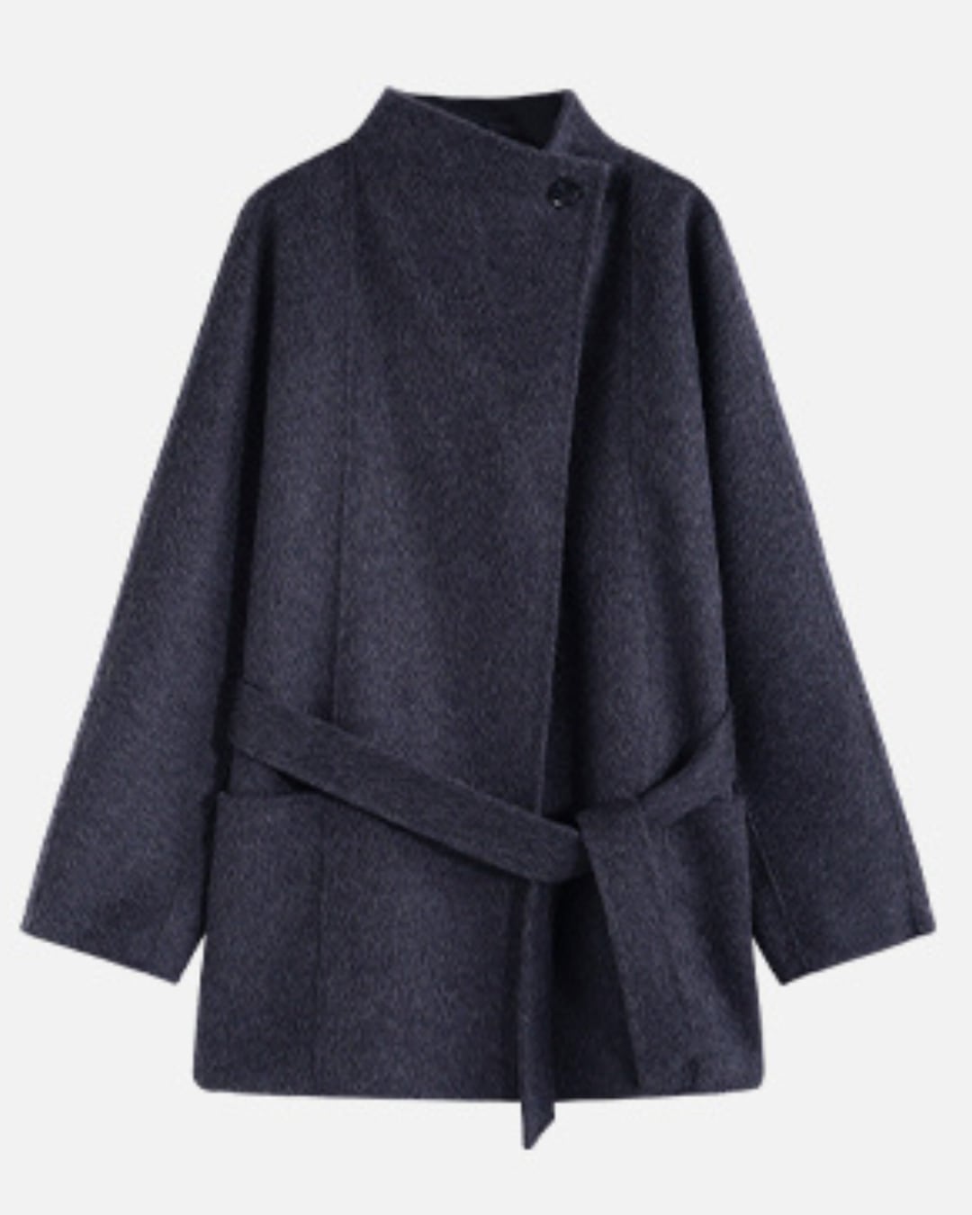 高級感漂うチャコールグレーのスタンドカラーコート。ゆったりとしたシルエットにベルトを加え、ウエストマークで女性らしいラインも演出。上質なウール・シルク・キャメル混素材で仕立てられた1着は、軽やかさと暖かさを兼ね備え、秋冬の装いに格上の印象を与えてくれます。