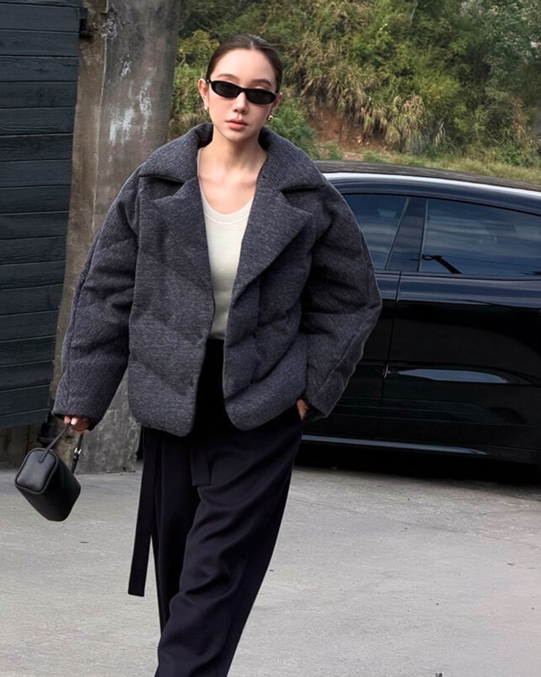 モード感漂う立体シルエットが魅力のショートダウンジャケット。大きめの襟とゆとりのあるフォルムが旬な印象を与えつつ、ボリュームを抑えたスマートなシルエットで大人の上品さも演出。中綿には90%ホワイトダックダウンを使用し、見た目以上に軽くて暖かい着心地に仕上げました。日常使いはもちろん、キレイめスタイルにもマッチする一着。