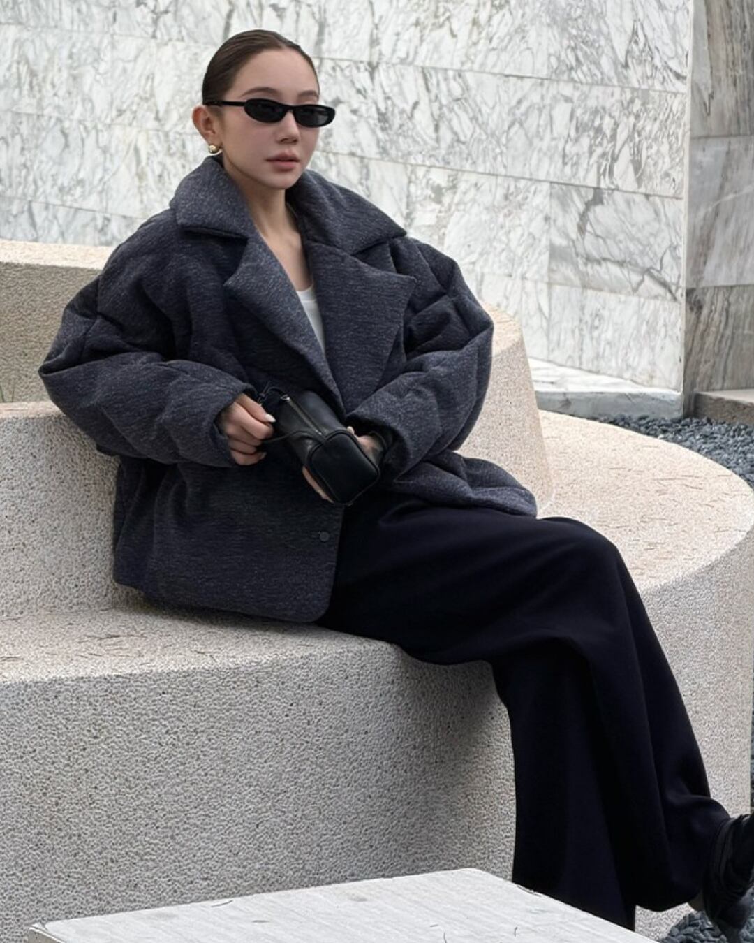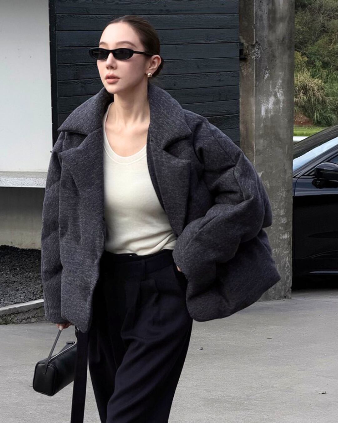 #ショートダウン #立体シルエット #大人カジュアル #軽量アウター #ネイビージャケット #モードコーデ #冬アウター