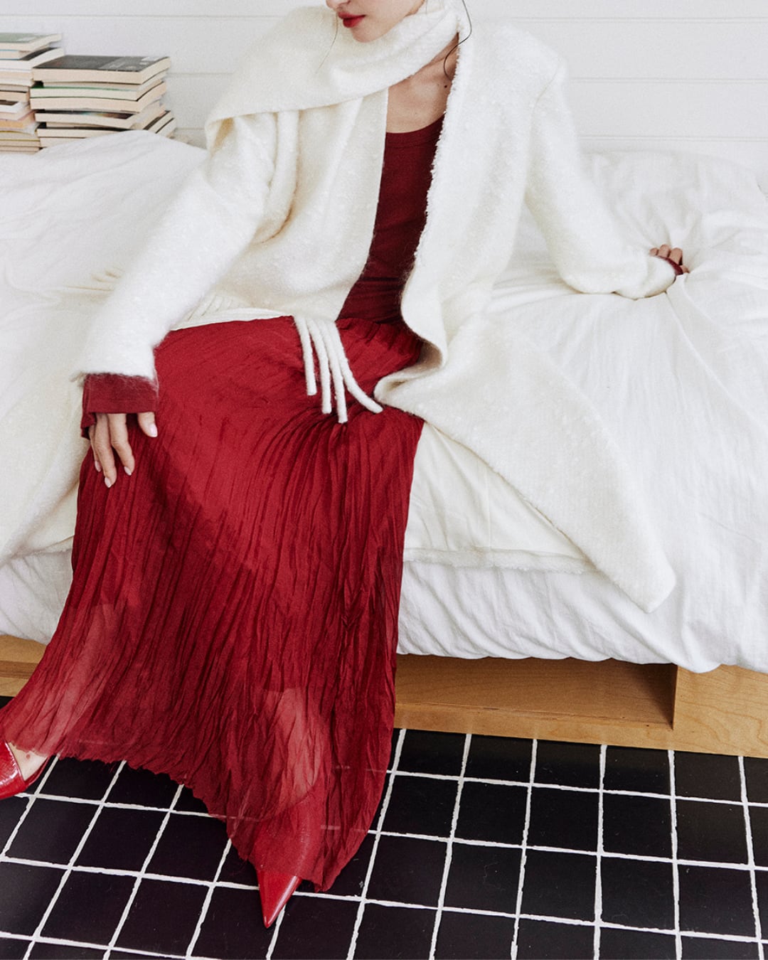 #ロングコート #フリンジストール #モヘア #ホワイトコート #冬アウター #きれいめコーデ #通勤スタイル #上品アウター