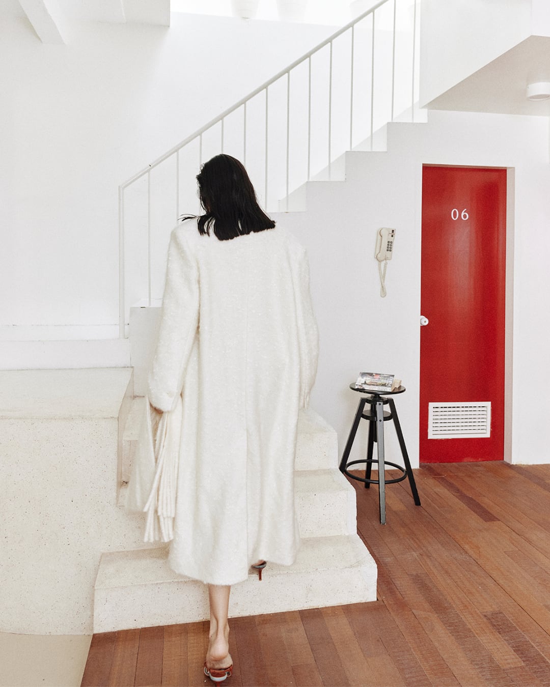 上品な印象のロングコートに、同素材のフリンジ付きストールがセットに。しっとりとした毛足のある生地が女性らしい雰囲気を演出します。Vネックのすっきりとした首元が抜け感を出し、シルエットはストンと落ちる直筒型。モードにもフェミニンにも着回せる、冬の主役級アウターです。