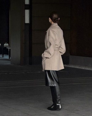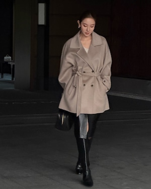 洗練されたシルエットが魅力のダブルボタンデザイン。立体的で柔らかな質感が上品さを引き立て、ウエストベルトでメリハリのあるスタイルに。都会的でモードな印象を演出する1着です。