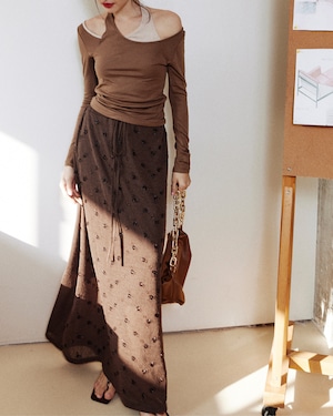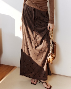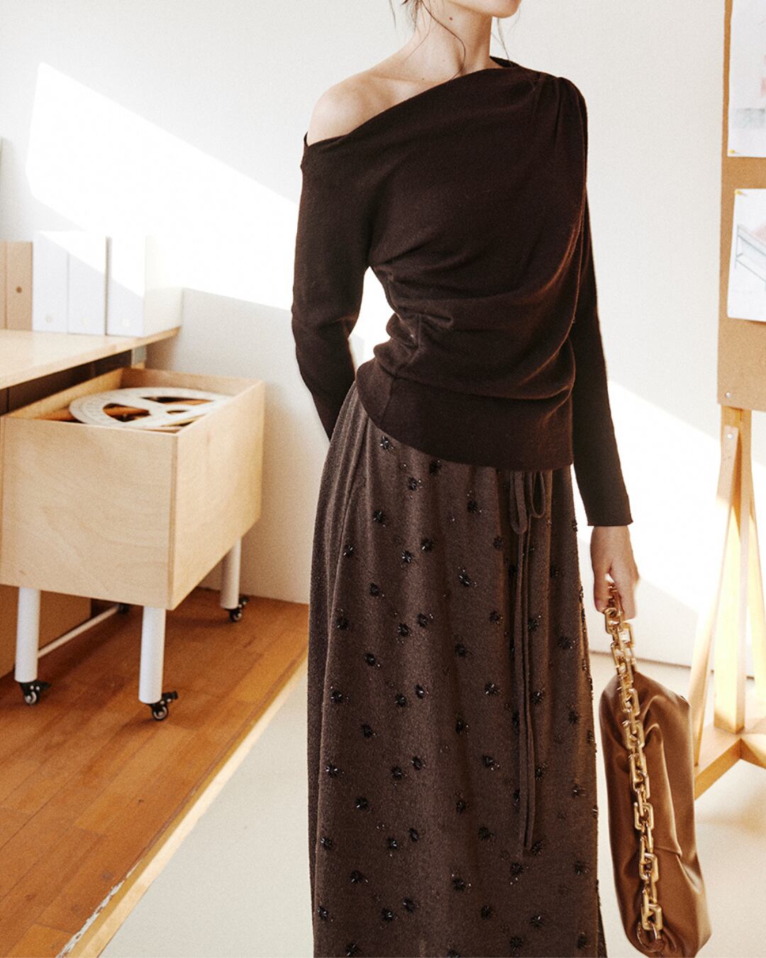 #ビーズ刺繍 #フラワーモチーフ #ニットスカート #ウエストドロスト #ブラウンコーデ #フェミニンムード