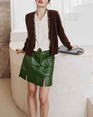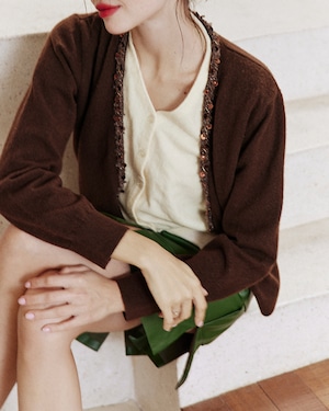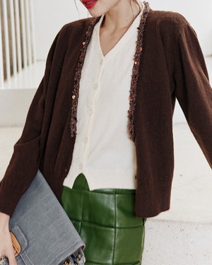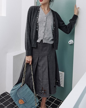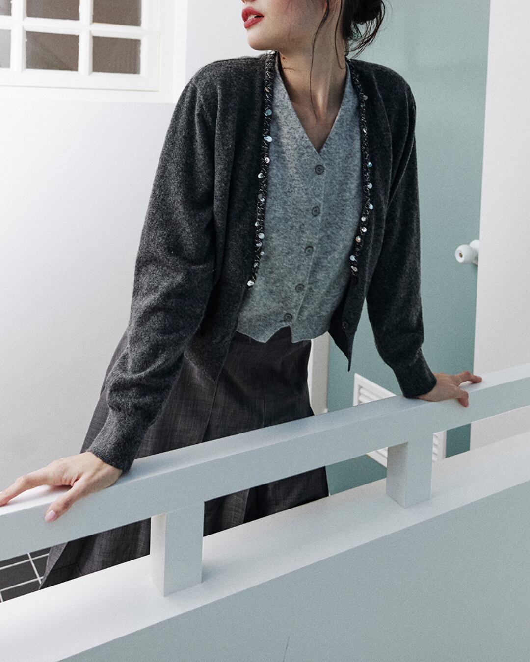 フェイクレイヤード仕様で、1枚でスタイルが決まる万能カーディガン。Vネックにあしらわれたビジュー装飾が華やかさをプラスし、シンプルなボトムと合わせるだけで上品な印象に。通勤にもデイリーにも使える、優秀デザインです。