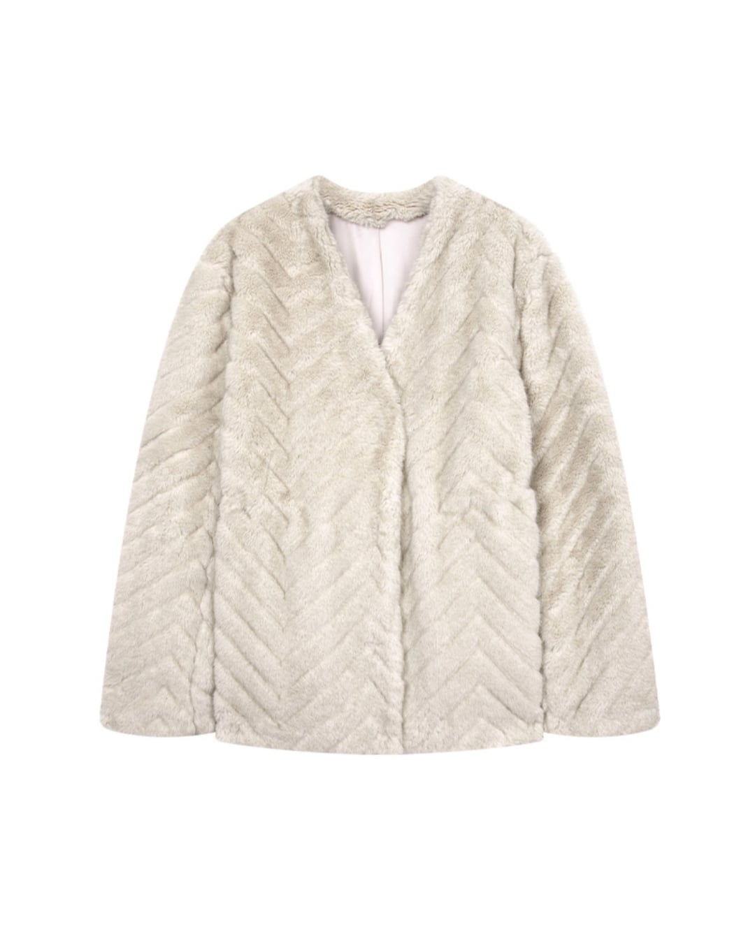 ふんわり柔らかな肌触りが魅力のフェイクファージャケット。表面に人字柄の織り模様が入っており、角度によってさりげない光沢感を演出します。滑らかな短毛ボアはボリュームがありながらも軽やかで、着膨れしにくいデザイン。ゆったりとしたHラインシルエットで体型カバー力も抜群。Vネックとドロップショルダーが首元や肩周りをすっきり見せてくれます。