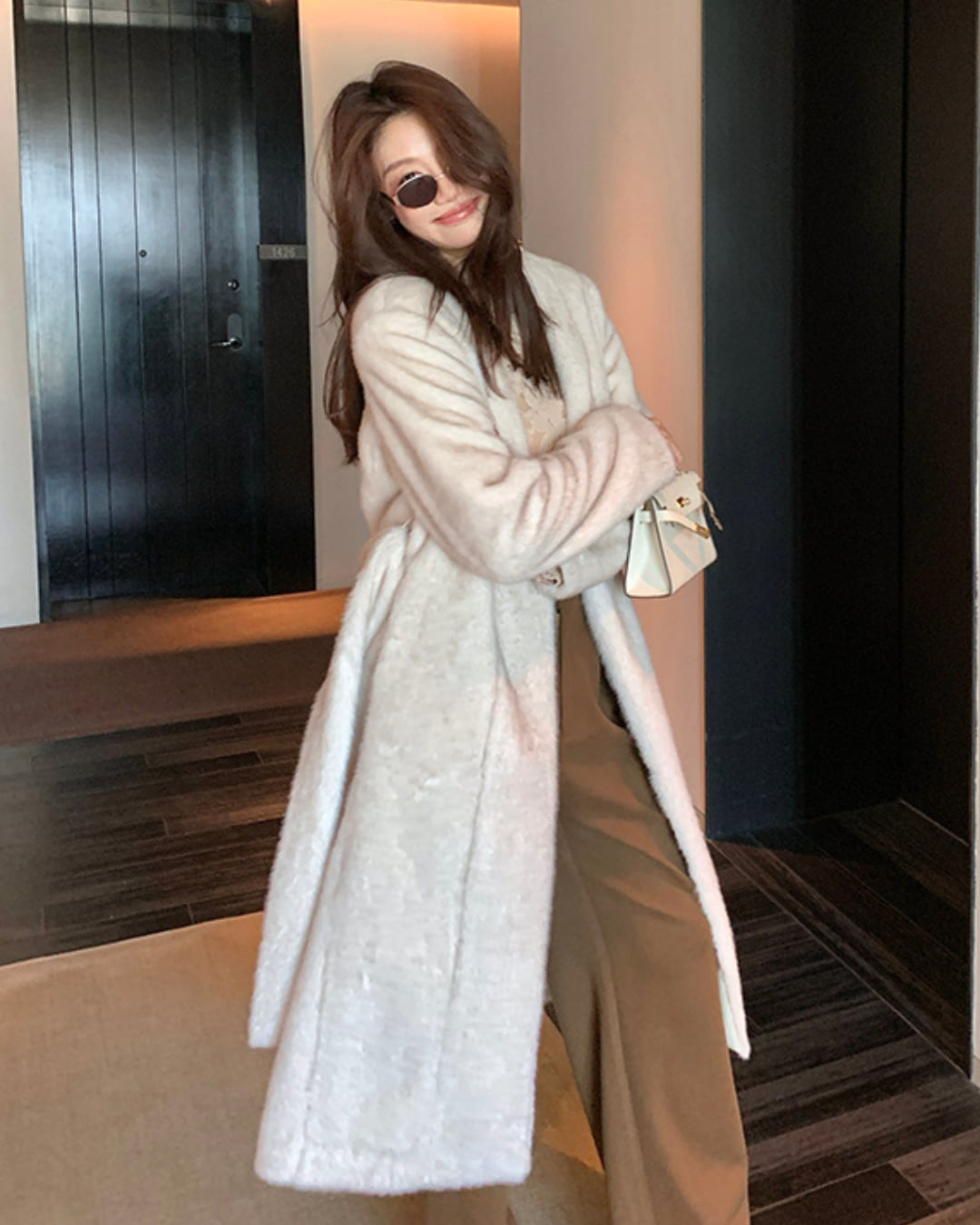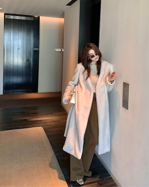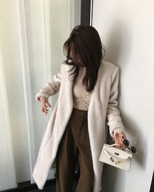 ふんわりとした上質なボア素材が特徴のロング丈ガウンコート。シンプルながらもVネック&共布ベルト付きで、ウエストを絞ってスタイルアップも叶います。ミニマルなデザインでどんなコーデにも合わせやすく、冬の主役アウターとして活躍間違いなし。