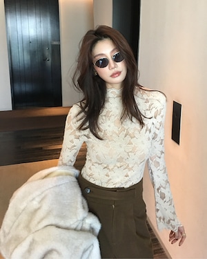 繊細なレース生地で仕立てられたハイネックの長袖トップス。全体にあしらわれたリーフ柄レースが柔らかく上品な印象を与え、ほんのり肌見せで女性らしさを演出。袖はフェミニンなフレアスリーブデザインで、1枚でもインナーとしても着回し力抜群。程よくフィットするシルエットで、レイヤードにも最適です。