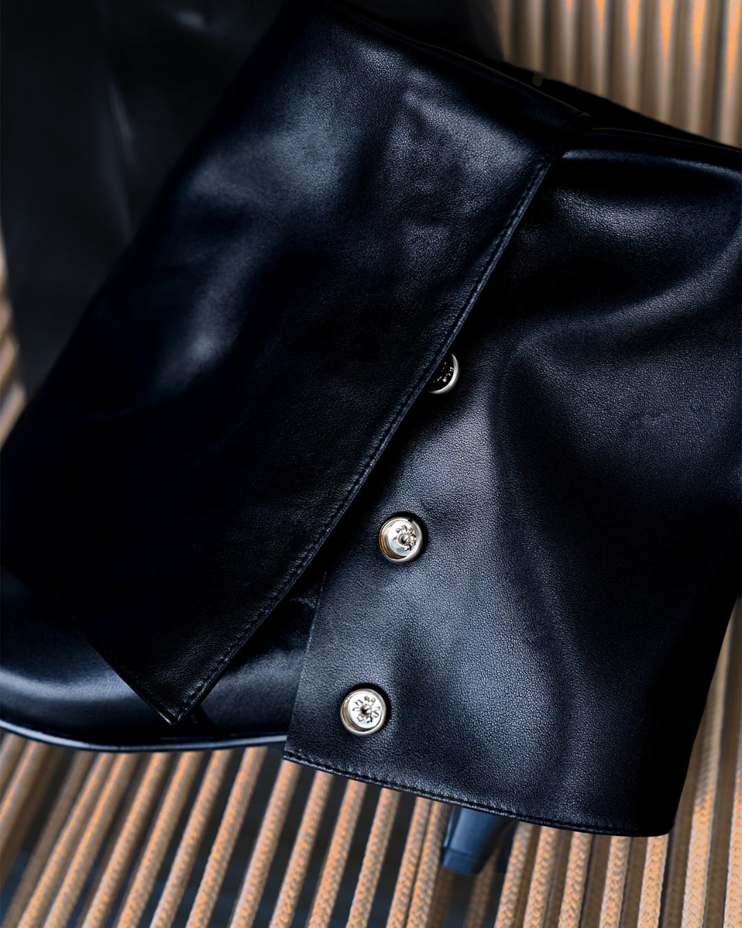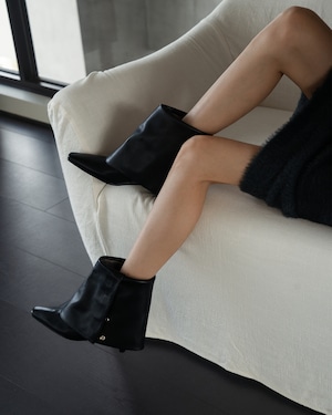 モード感溢れるスクエアトゥと、筒部分の立体的なシルエットが魅力のミッドブーツ。艶やかなフルグレインレザーを使用し、上品で存在感のある1足に仕上げました。サイドにはさりげなくボタンディテールが施され、シンプルながらも洗練された印象に。布張りのライニングで足当たりも柔らかく、快適な履き心地。シーズンにぴったりの一足で、スカートにもパンツにも好相性◎