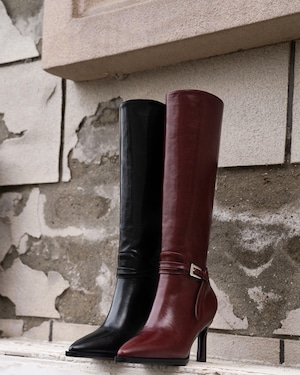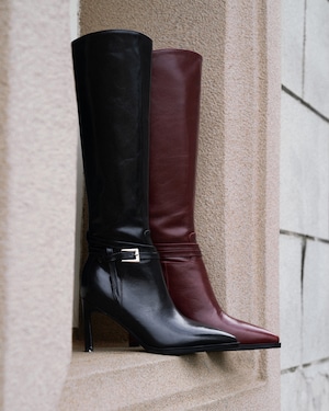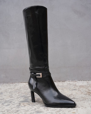 美しい艶感とシャープなポインテッドトゥが魅力のハイロングブーツ。足首にあしらわれたレザーベルトがアクセントになり、クラシカルながらも都会的な洗練を感じさせる一足です。高めの7.5cmヒールでスタイルアップも叶い、シンプルなコーディネートに映える存在感がポイント。